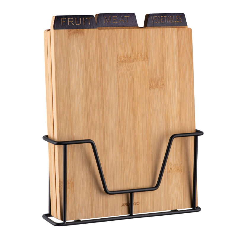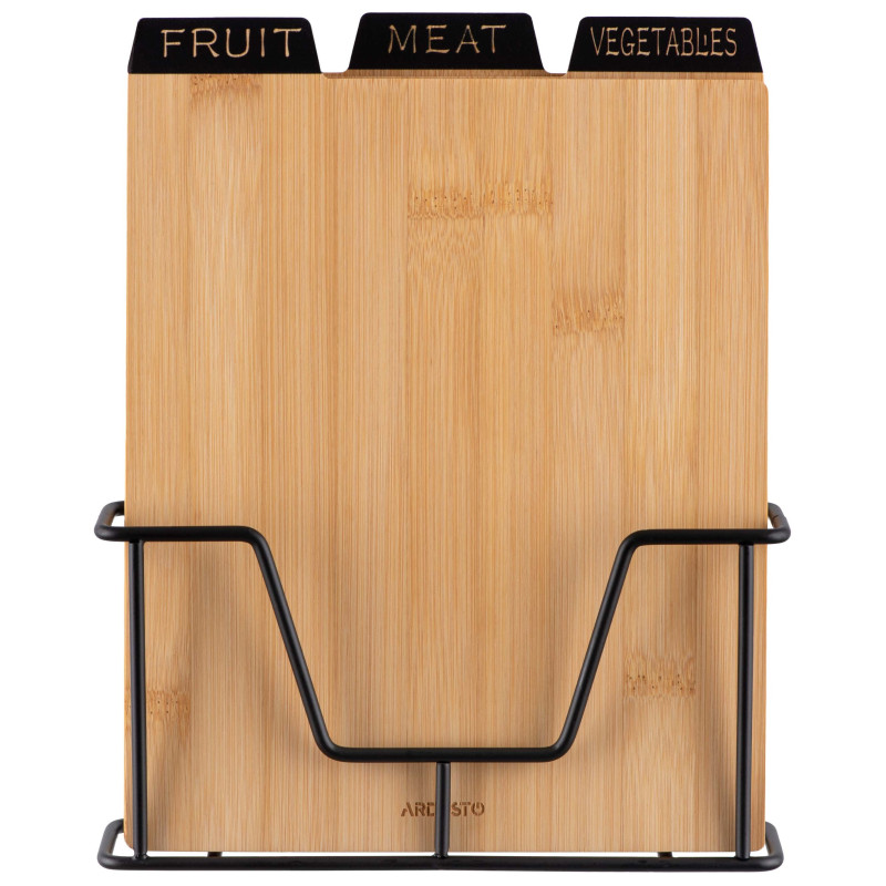 Кухонні дошки ARDESTO серії Midori забезпечать комфорт під час нарізання продуктів і стануть корисним аксесуаром на кухні. Вироби виготовлено з бамбука – екологічного та гігієнічного матеріалу. У наборі три дошки прямокутної форми розміром 23,5 × 7,5 × 27 см – достатньо для створення кулінарних шедеврів. Вироби мають подвійне призначення – їх можна використовувати як для нарізання продуктів, так і для презентації страв. Підставка, яку виготовлено з металу, – це зручне та стильне рішення для організації простору, з нею приладдя завжди буде напохваті. Вироби не рекомендовано мити в посудомийній машині. Цей стильний набір дошок буде вдалим подарунком для близьких і друзів.