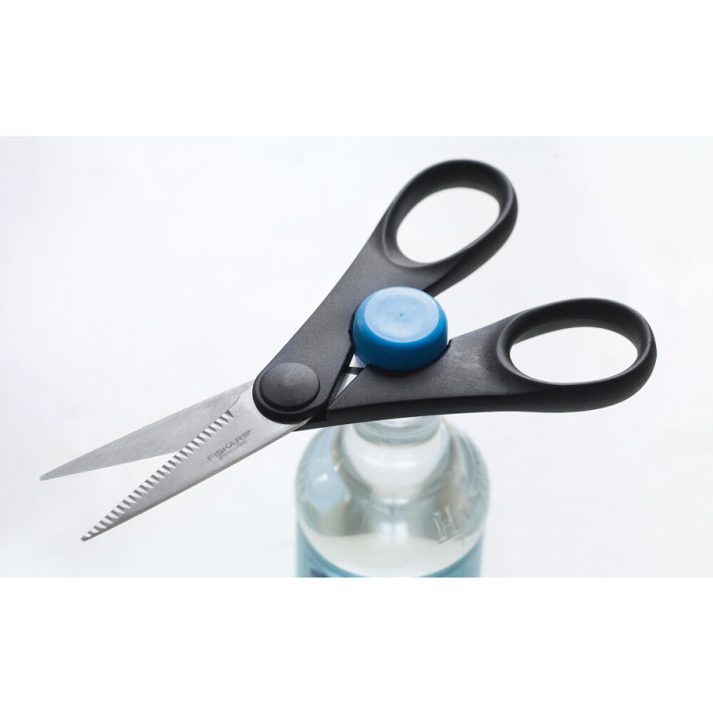 Ножиці кухонні Fiskars Essential з відкривачкою для пляшок. Довжина виробу - 20 см. Матеріал леза - нержавіюча сталь.