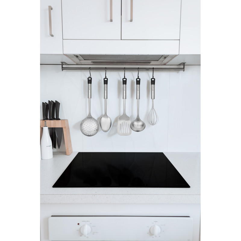- Стильний дизайн ергономічної ручки з нержавіючої сталі та чорним поліпропіленовим наконечником з отвором для зручного зберігання на гачках.