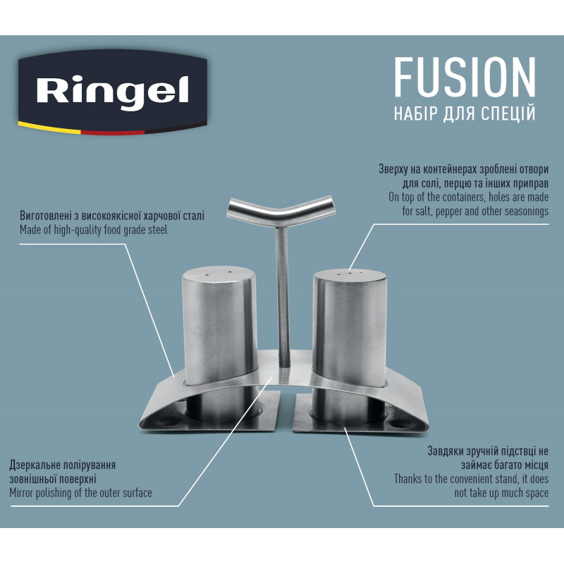 Набір для спецій Fusion з нержавіючої сталі дозволить зручно зберігати сіль, перець та інші приправи.