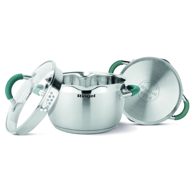 Мірна шкала на внутрішній стороні стінки каструлі Ringel допомагає точніше дотримуватися пропорцій сухих і рідких інгредієнтів. Прозора кришка з термостійкого скла оснащена клапаном для виходу пари, що дозволяє стежити за приготуванням їжі та випускати зайву пару, не знімаючи кришку з каструлі. Спеціальні жолоби для злиття рідини роблять процес приготування максимально зручним, легким і комфортним.