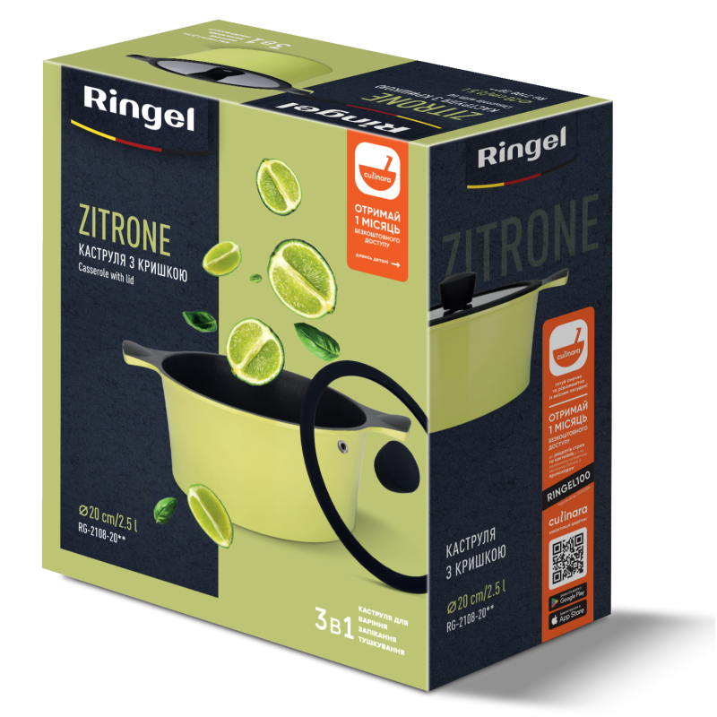 Каструля з литого алюмінію серії Zitrone від Ringel відрізняється товстостінною конструкцією та надійним антипригарним покриттям, завдяки чому цей вид посуду є максимально універсальним рішенням для приготування безлічі видів страв.