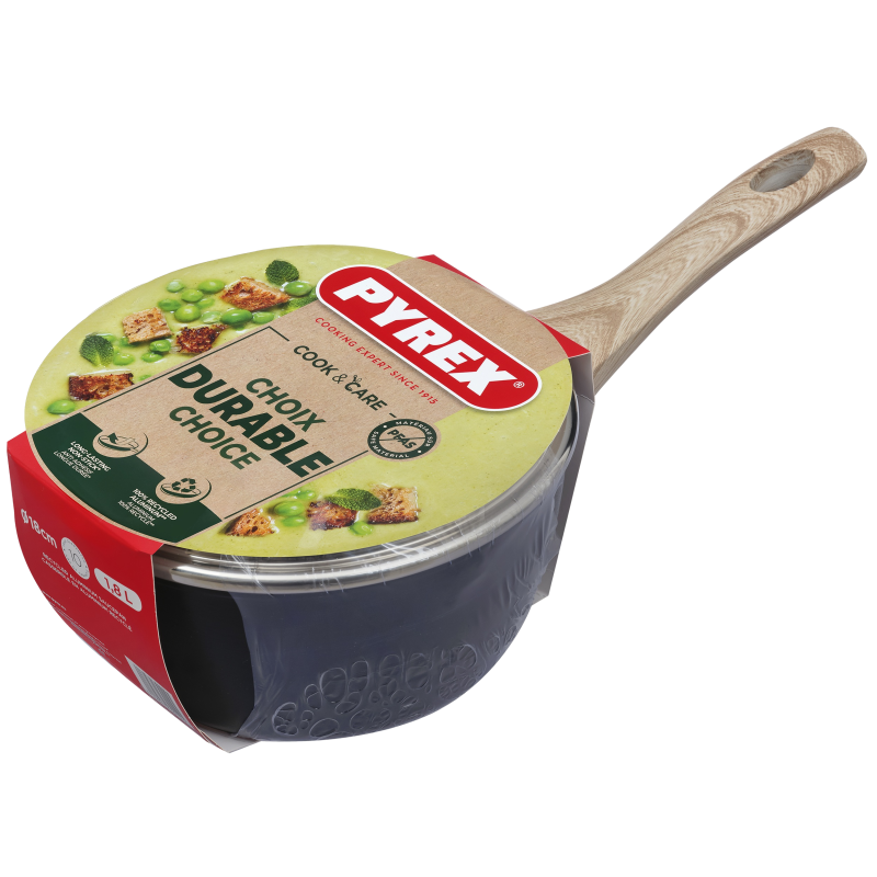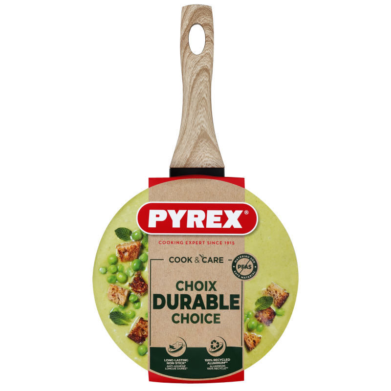 Pyrex Cook&Care – це серія посуду, яка поєднує в собі турботу про ваше здоров'я та навколишнє середовище. Зроблений з переробленого алюмінію, він має міцне керамічне покриття Sol-Gel, що не містить шкідливих PFAS. У 2 рази стійкіший до подряпин і зношування ніж звичайні покриття. Cook&Care підходить для всіх типів плит, включаючи індукційні.