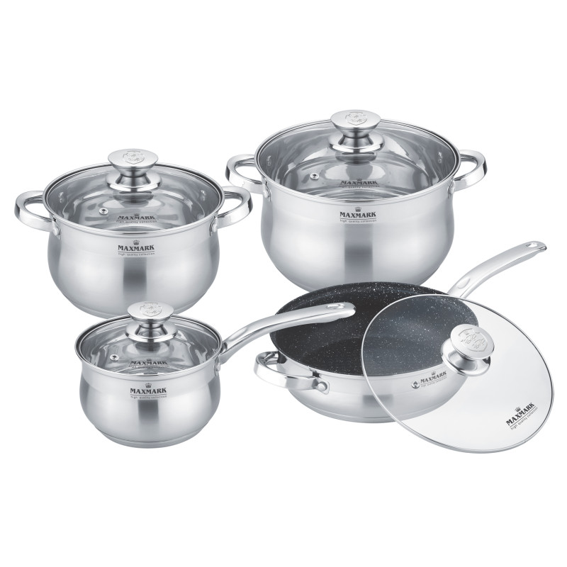 | Розмір | • Ковш з кришкою: 16x10,5 cм;• Каструля з кришкою: 20x12,5 см;• Каструля з кришкою: 22x13,5 cм;• Сковорода з кришкою, з мармуровим антипригарним покриттям: 24x7,5 cм |