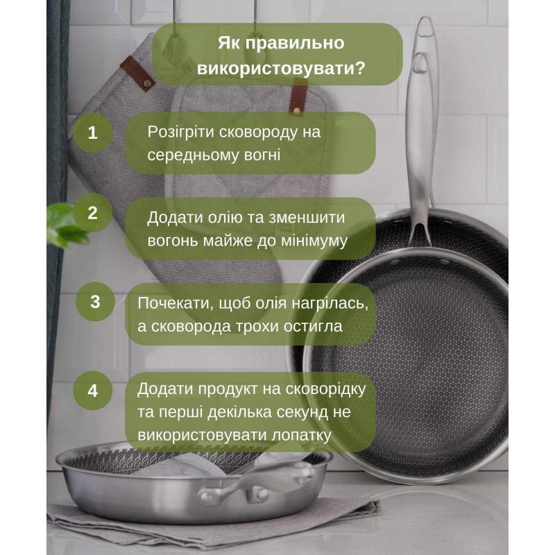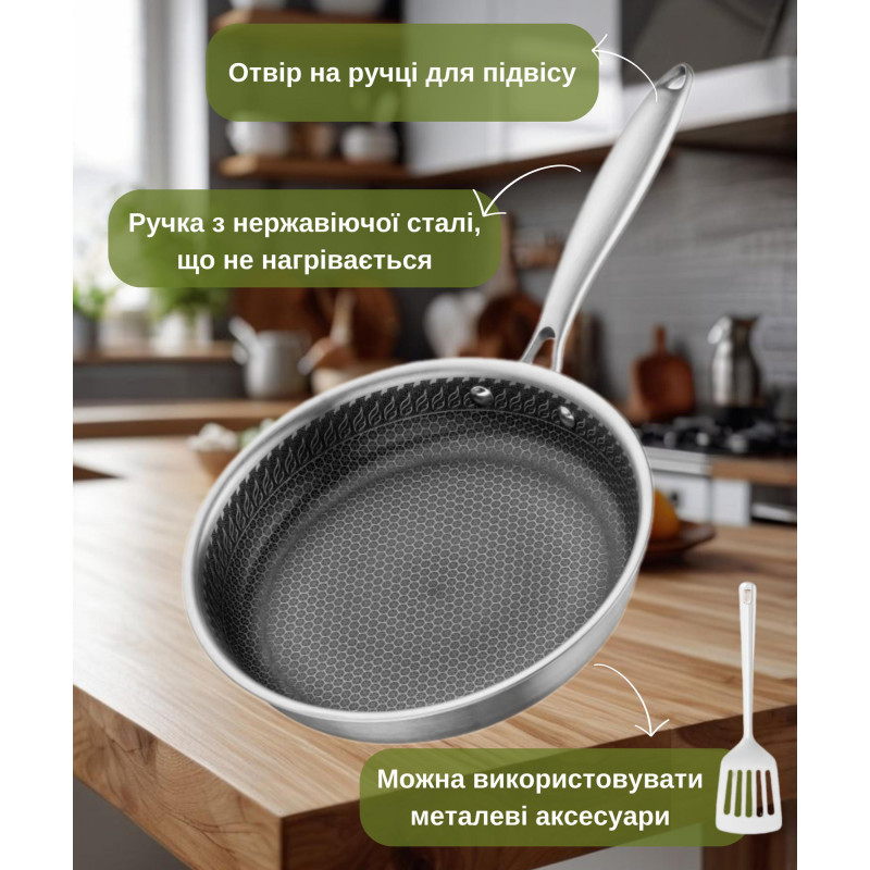 | Матеріал сковороди | нержавіюча сталь/Технологія Triply: нержавіюча сталь 304+алюміній+нержавіюча сталь 430 (три шари) |