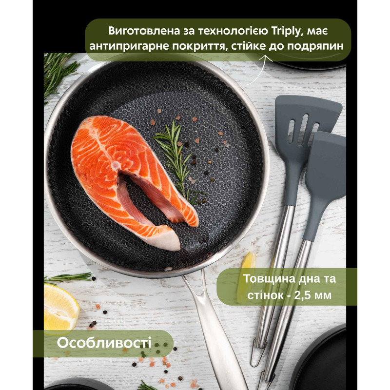 Виготовлена з нержавіючої сталі за технологією Triply, сковорода має протипригарне покриття, стійке до подряпин. Можна використовувати металеві аксесуари. Виріб можна мити в посудомийній машині. Діаметр моделі становить 26 см. За висоти 5 см сковорода має однакову товщину стінок і дна – 2,5 мм. Вирізняється широкою сумісністю: сковорідка придатна до використання на газових, галогенних, склокерамічних, індукційних та електричних плитах.