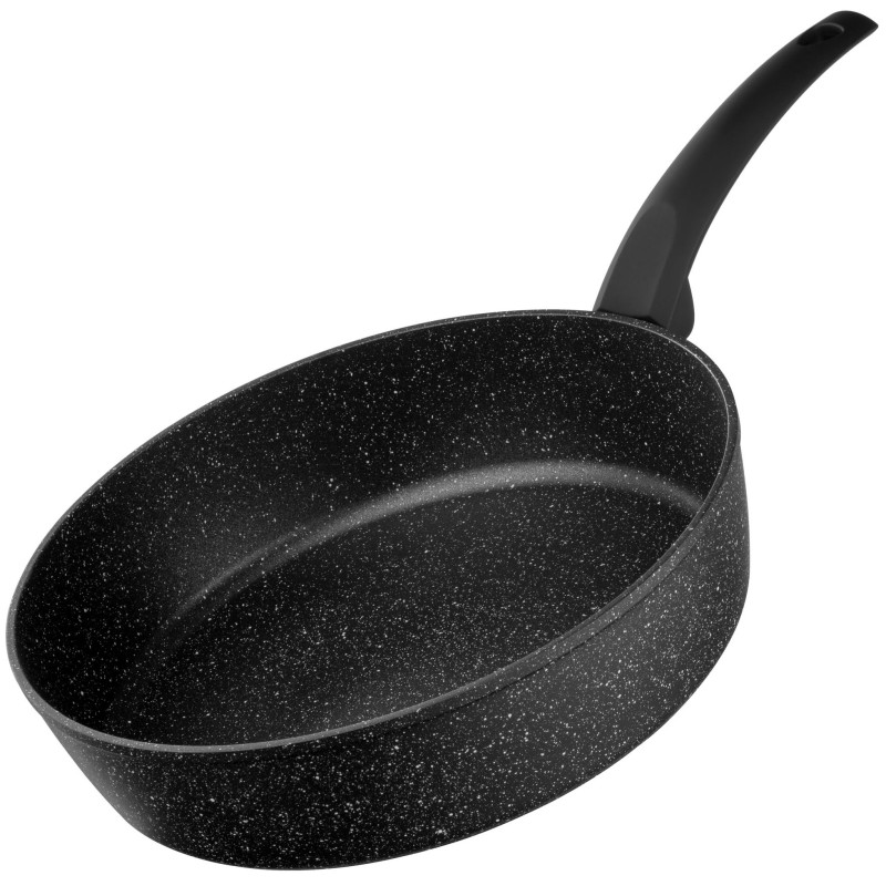 Сковороду виготовлено з кованого алюмінію, її діаметр – 28 см. За висоти 7 см товщина стінок становить 2,6/4 мм, а дна – 2,6 мм. Внутрішня поверхня має тришарове протипригарне покриття PFLUON, а бакелітове руків’я – soft-touch. З огляду на це виріб не рекомендовано мити в посудомийній машині.