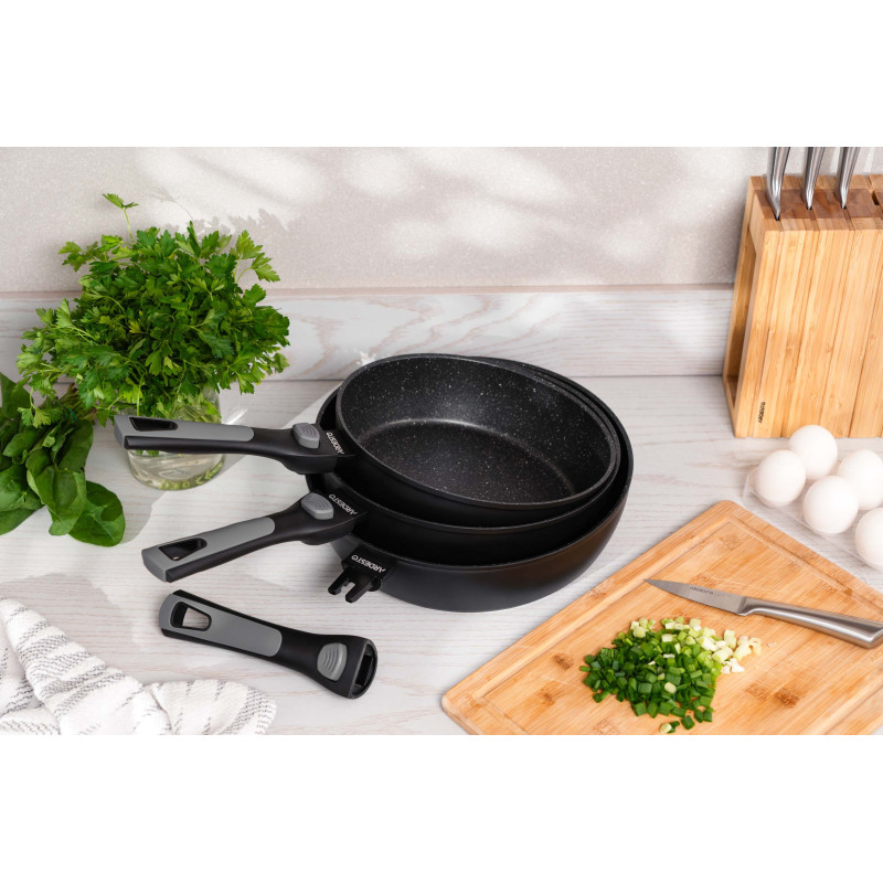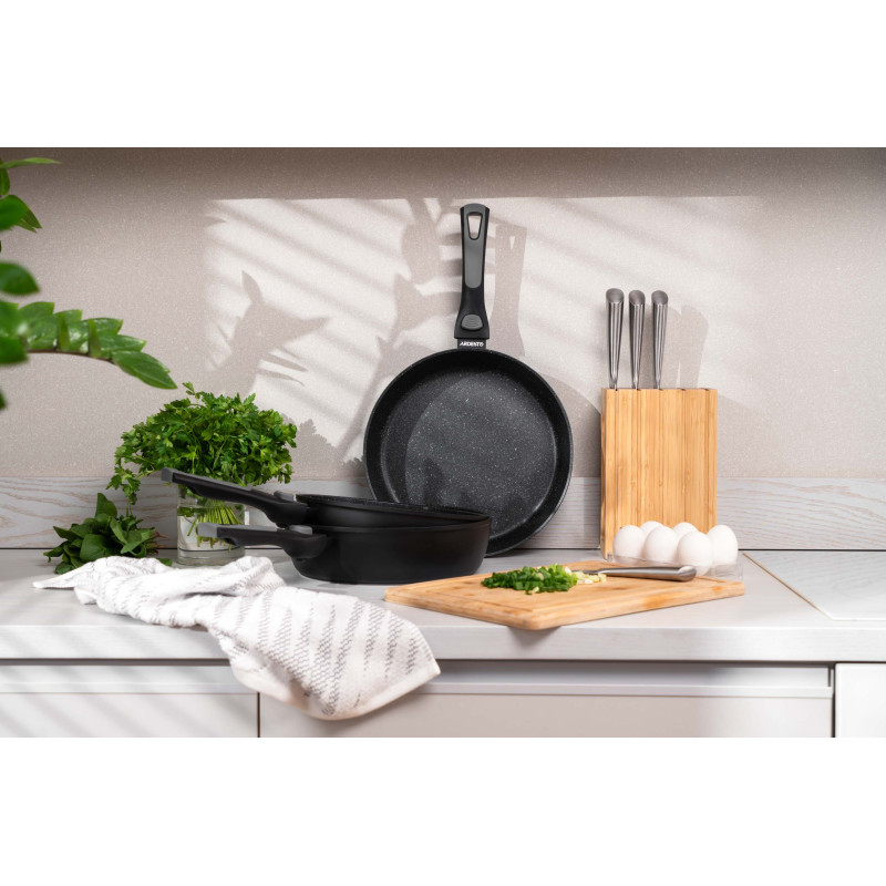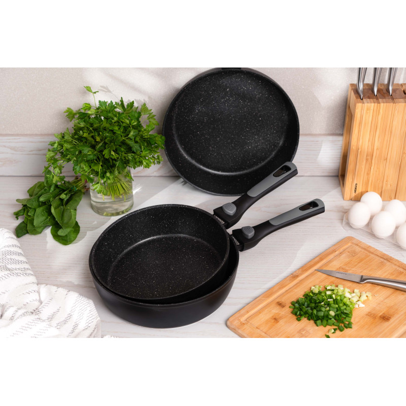 Глибоку сковороду зі знімним руків’ям ARDESTO Gemini діаметром 24 см виготовлено з кованого алюмінію, який забезпечує швидке та рівномірне нагрівання. Сковороду вкрито двома шарами протипригарного покриття PPG XYLAN PLUS, тож під час приготування можна використовувати менше олії та дотримуватися здорового харчування.