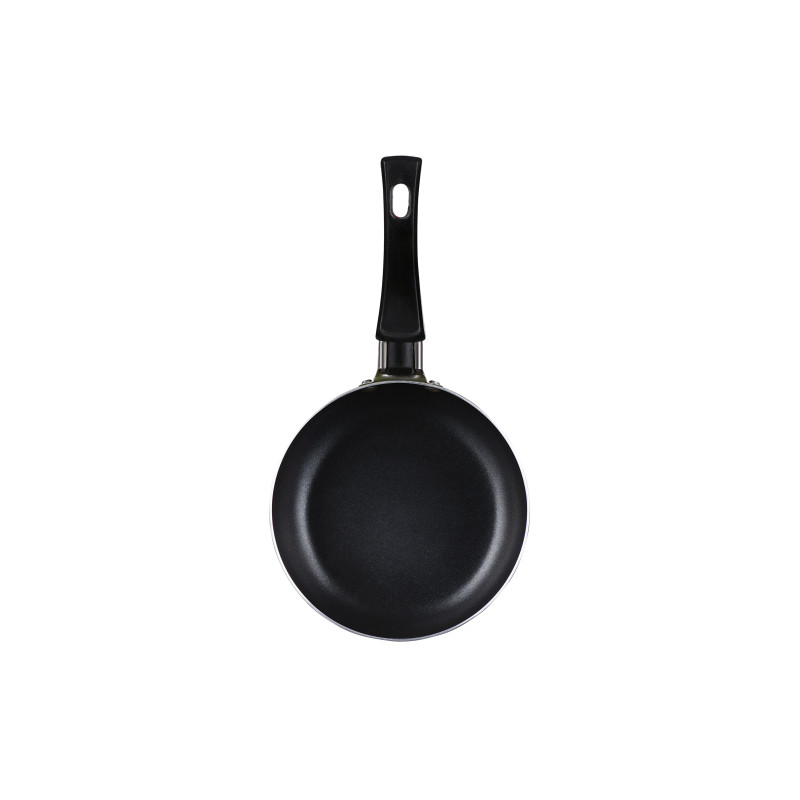 Компактну сковороду діаметром 14 см виготовлено з кованого алюмінію і призначено для використання на газових, електричних, склокерамічних та галогенних плитах. Сковорода сірого кольору. Має антипригарне покриття та зручну бакелітову ручку. Висота – 38 мм, товщина дна і стінок – 1,8 мм.