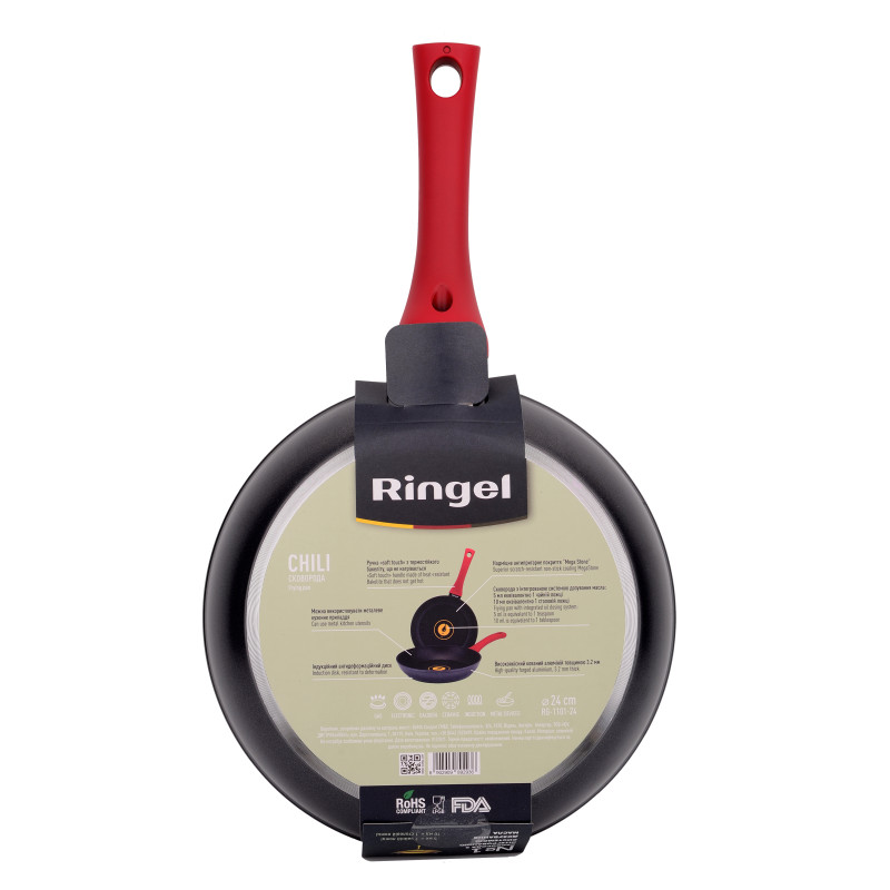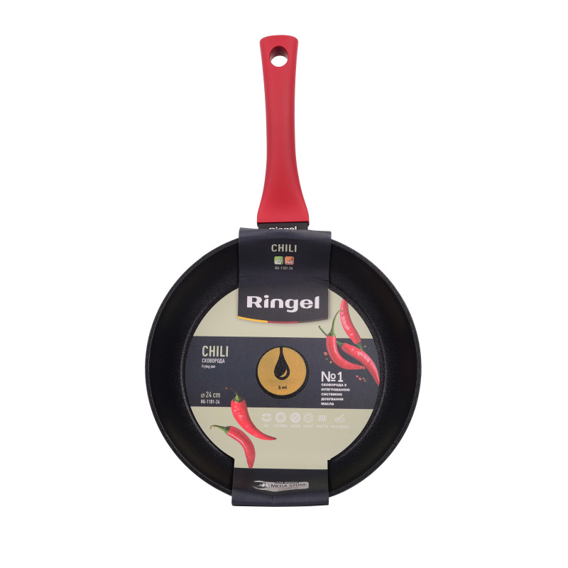 Сковороди Chili від RINGEL - це посуд, що має по-справжньому сильній характер, завдяки лаконічному дизайну і надміцному антипригарному покриттю MEGASTONE. Це покриття допускає акуратне використання, в тому числі, металевих аксесуарів протягом приготування їжі. Стандартний типорозмір сковорідок дозволяє з легкістю підібрати відповідну кришку до кожної моделі. Завдяки товстому алюмінію завтовшки 3,2 мм цей посуд ідеально підходить для приготування смачних м'ясних страв.