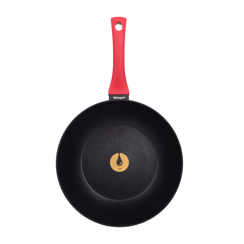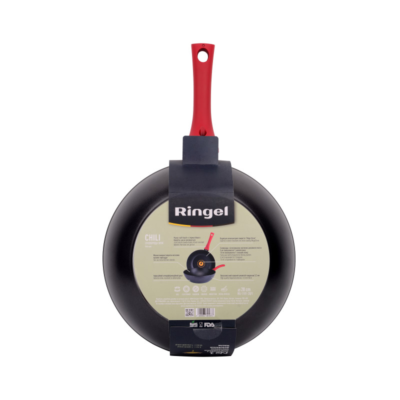 Сковороди Chili від RINGEL - це посуд, що має по-справжньому сильній характер, завдяки лаконічному дизайну і надміцному антипригарному покриттю MEGASTONE. Це покриття допускає акуратне використання, в тому числі, металевих аксесуарів протягом приготування їжі. Стандартний типорозмір сковорідок дозволяє з легкістю підібрати відповідну кришку до кожної моделі. Завдяки товстому алюмінію завтовшки 3,2 мм цей посуд ідеально підходить для приготування смачних м'ясних страв.