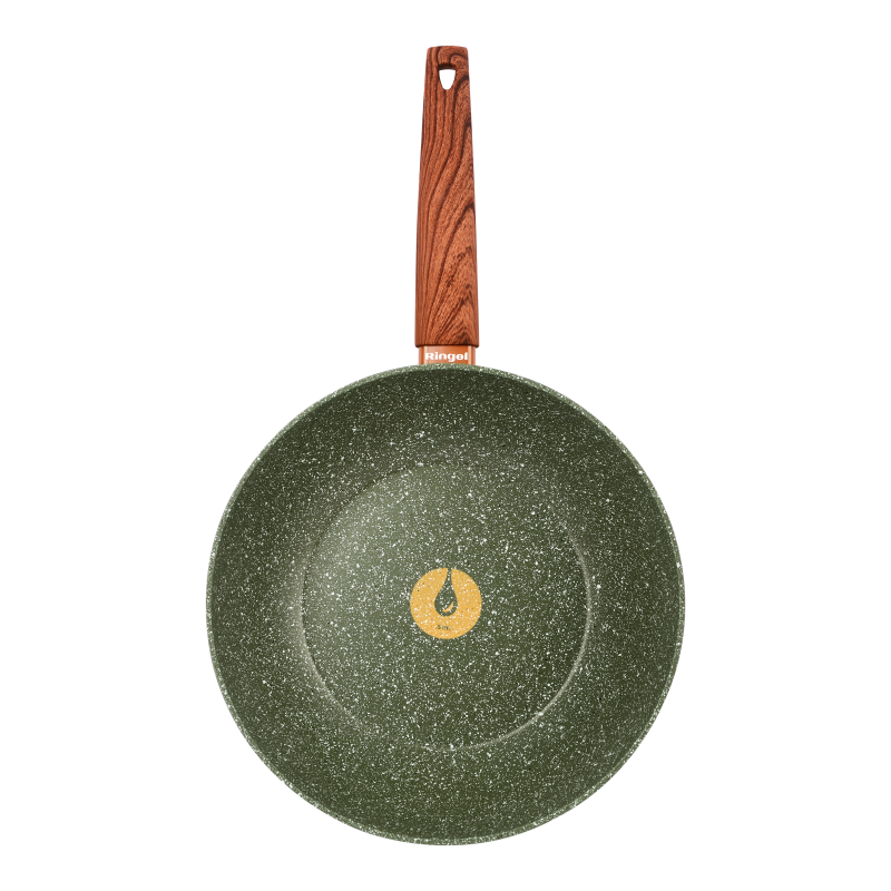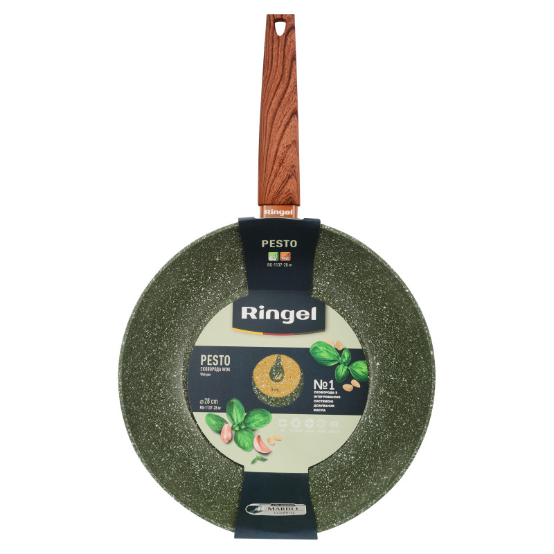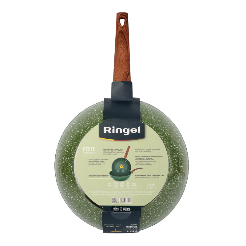Серія сковорідок PESTO від Ringel - універсальний помічник на кухні для приготування і розігрівання найрізноманітнішої їжі. Виготовлена з високоякісного кованого алюмінію 3,2 мм, ця сковорода є міцним посудом зі швидким і рівномірним нагріванням. У даній серії використовується мармурове антипригарне покриття Marble, що що робить її дуже довговічним та надійним виробом і дозволяє використовувати менше олії.