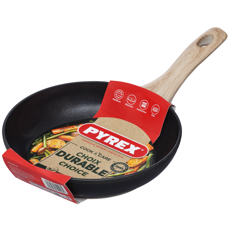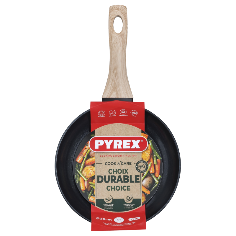 Pyrex Cook&Care – це серія посуду, яка поєднує в собі турботу про ваше здоров'я та навколишнє середовище. Зроблений з переробленого алюмінію, він має міцне керамічне покриття Sol-Gel, що не містить шкідливих PFAS. У 2 рази стійкіший до подряпин і зношування ніж звичайні покриття. Cook&Care підходить для всіх типів плит, включаючи індукційні.