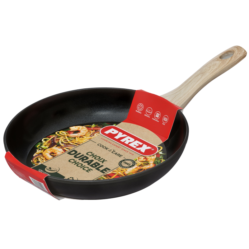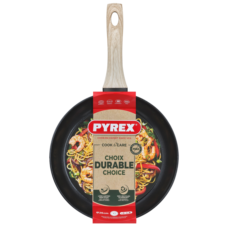 Pyrex Cook&Care – це серія посуду, яка поєднує в собі турботу про ваше здоров'я та навколишнє середовище. Зроблений з переробленого алюмінію, він має міцне керамічне покриття Sol-Gel, що не містить шкідливих PFAS. У 2 рази стійкіший до подряпин і зношування ніж звичайні покриття. Cook&Care підходить для всіх типів плит, включаючи індукційні.