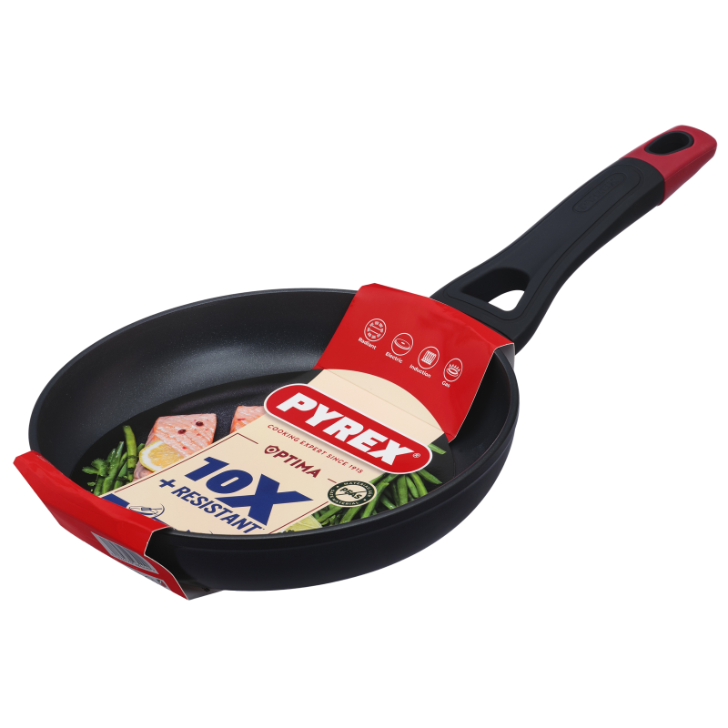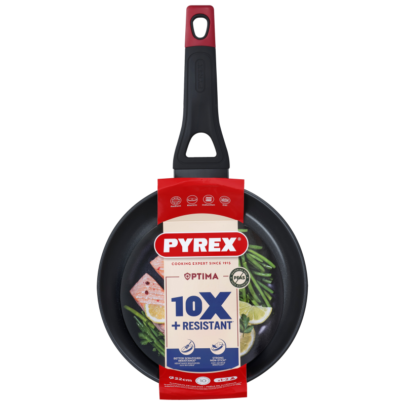 Серія Pyrex Optima – це посуд з кованого алюмінію з міцним антипригарним покриттям Whitford Xylan+. Ексклюзивна Y-подібна ручка з ергономічним дизайном і soft touch покриттям забезпечує комфорт та безпеку використання. Яскравий силіконовий акцент додає стилю. Підходить для всіх типів плит, включаючи індукційні.