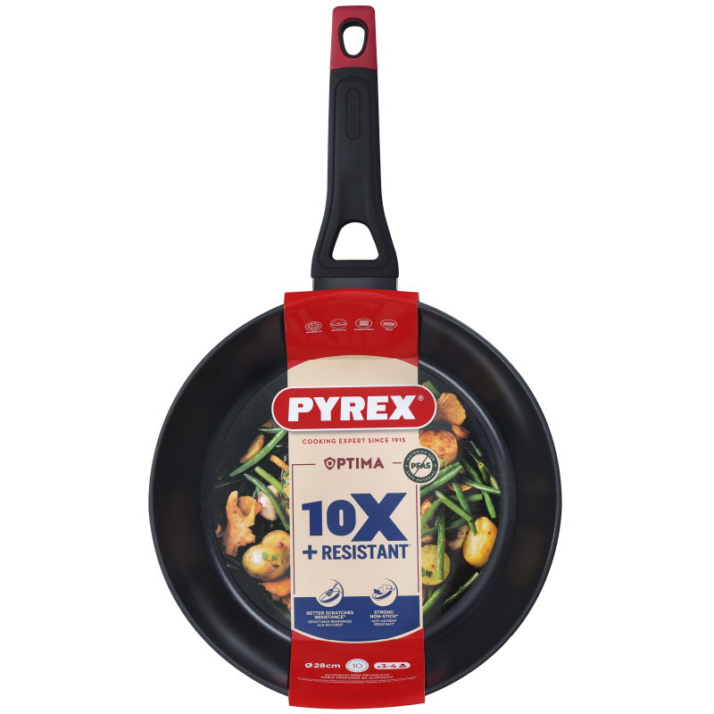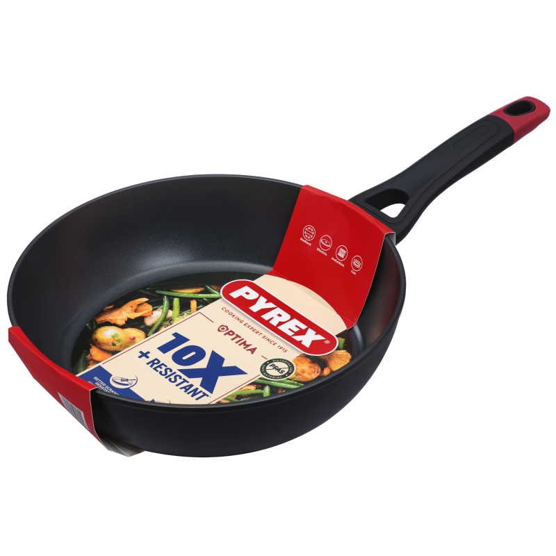 Серія Pyrex Optima – це посуд з кованого алюмінію з міцним антипригарним покриттям Whitford Xylan+. Ексклюзивна Y-подібна ручка з ергономічним дизайном і soft touch покриттям забезпечує комфорт та безпеку використання. Яскравий силіконовий акцент додає стилю. Підходить для всіх типів плит, включаючи індукційні.