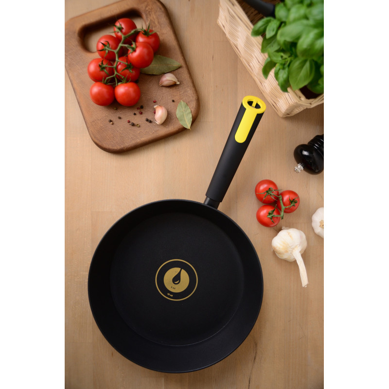 Зручність використання даної сковороди досягається завдяки і ергономічній ручці з бакеліту. Додаткове покриття soft-touch, крім тактильного задоволення, захищає руки від опіків і дозволяє не вислизає навіть з вологих долонь. Додаткова яскрава вставка підкреслює дизайн сковороди.