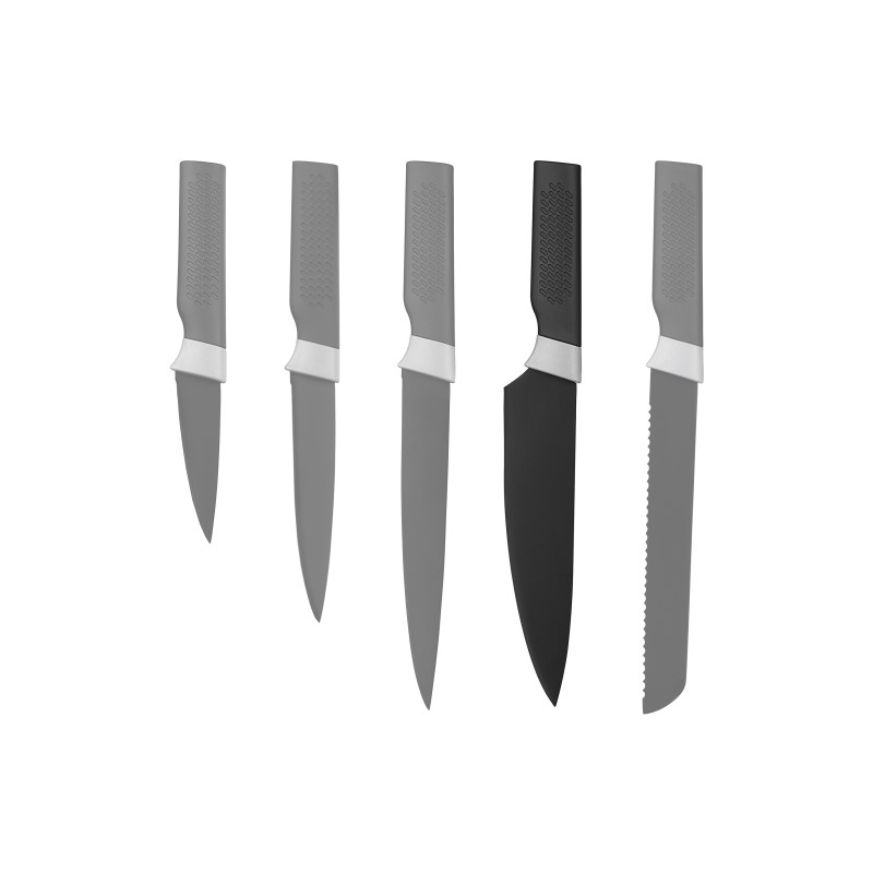 Лезо ножа виготовлено з нержавіючої сталі 3CR13 з покриттям чорного кольору, а ручка з міцного пластику. Не підходить для використання в посудомийній машині.