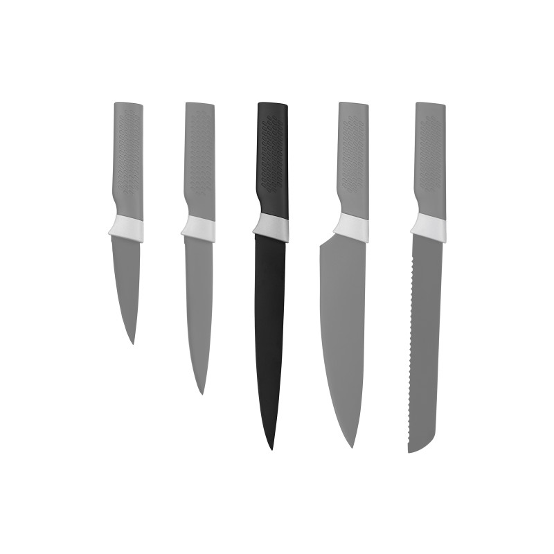 Лезо ножа виготовлено з нержавіючої сталі 3CR13 з покриттям чорного кольору, а ручка з міцного пластику. Не підходить для використання в посудомийній машині.