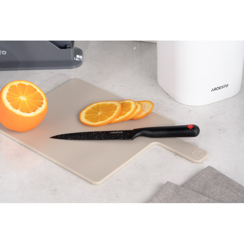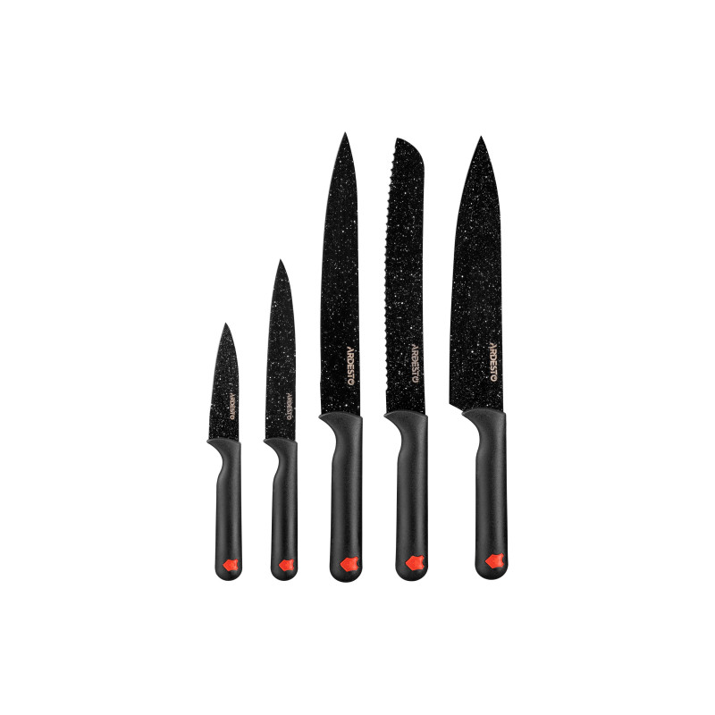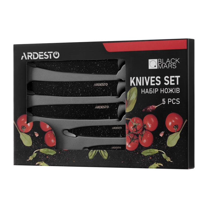 Кухня – місце, де створюють кулінарні шедеври й без якісного інструментарію тут не обійтися. Набір ножів ARDESTO Black Mars із п’яти предметів – це вдале комплексне рішення, де наявні: кухарський ніж (20,3 см), універсальний ніж (12,7 см), ніж для хліба (20,3 см), ніж слайсерний (20,3 см) і ніж для чищення овочів (8,9 см).