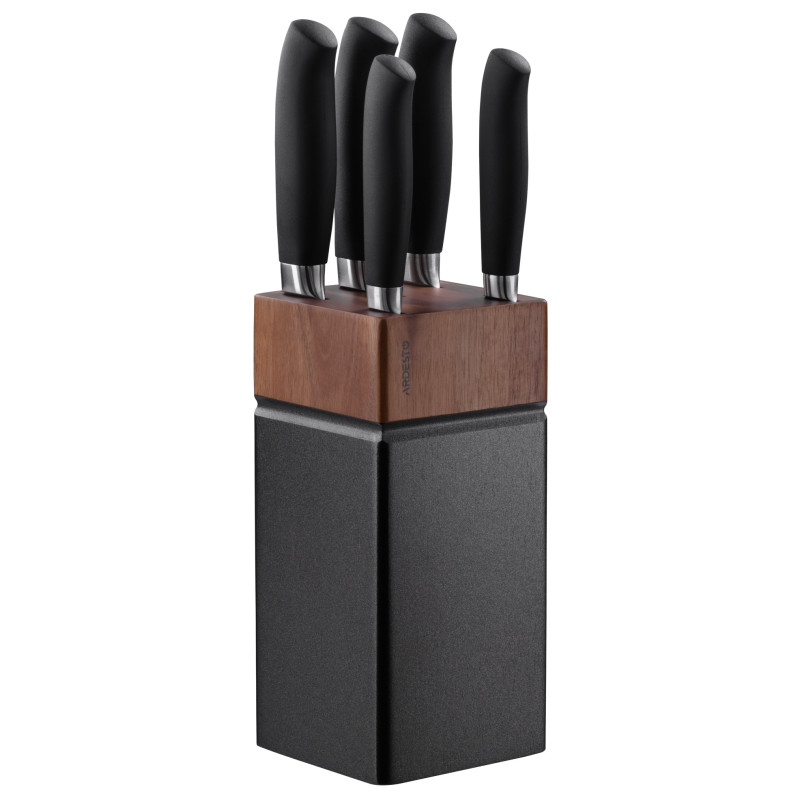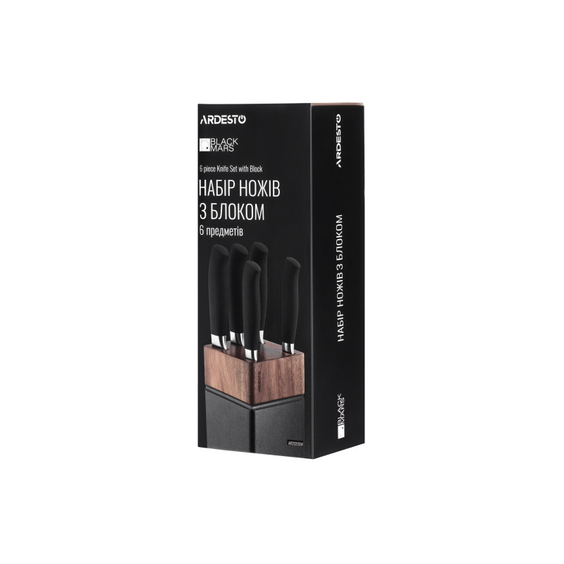 Набір складається з п’яти ножів серії Black Mars, до якого входять універсальний ніж, ніж кухарський, ніж для хліба, ніж для овочів, ніж-слайсер, та дерев’яного блоку. Леза та ручки виготовлені з нержавіючої сталі. Не підходить для використання в посудомийній машині.
