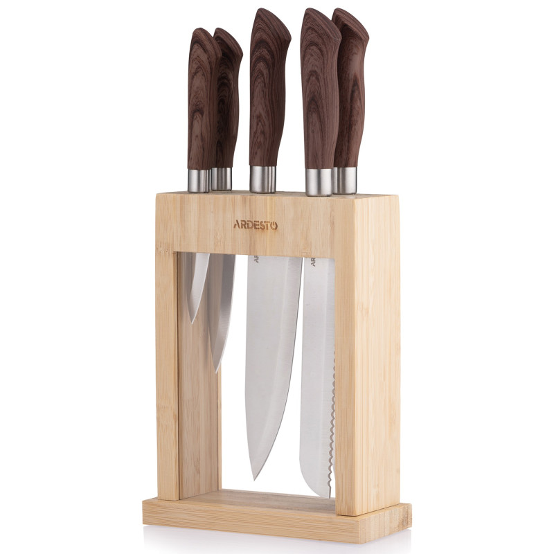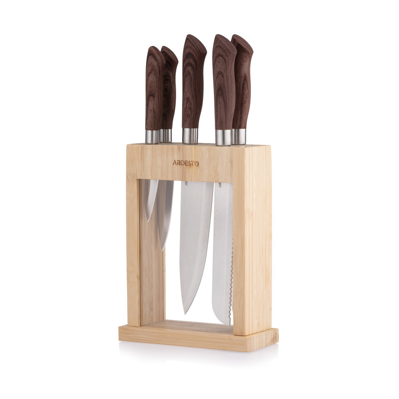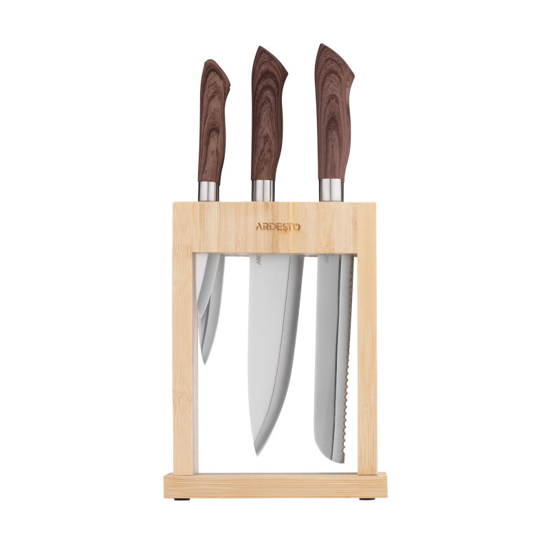 Ножі з набору ARDESTO Midori поєднують високу функціональність із естетично привабливим дизайном. Виготовлене з нержавіючої сталі 3cr13 лезо забезпечить довготривале та безпечне користування. Руків’я з пластику з додаванням дерева з TPR-покриттям забезпечує гарний захват, запобігає ковзанню навіть у вологих руках і має високу стійкість до зношування.