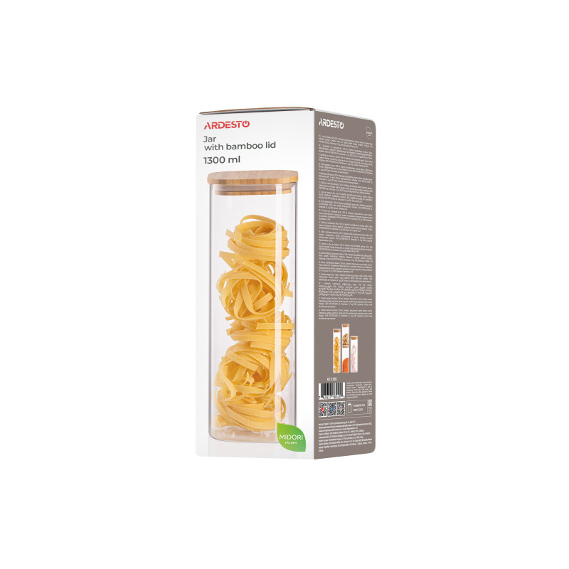 Квадратну банку для зберігання ARDESTO серії Midori об’ємом 1 300 мл виготовлено з екологічного боросилікатного скла, яке не вбирає запахи, зберігаючи аромат і смак продуктів, та гарантує довговічність виробу. Бамбукова кришка забезпечує герметичне паковання. Виріб можна мити в посудомийній машині (крім бамбукової кришки).