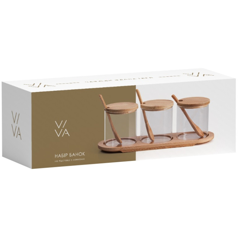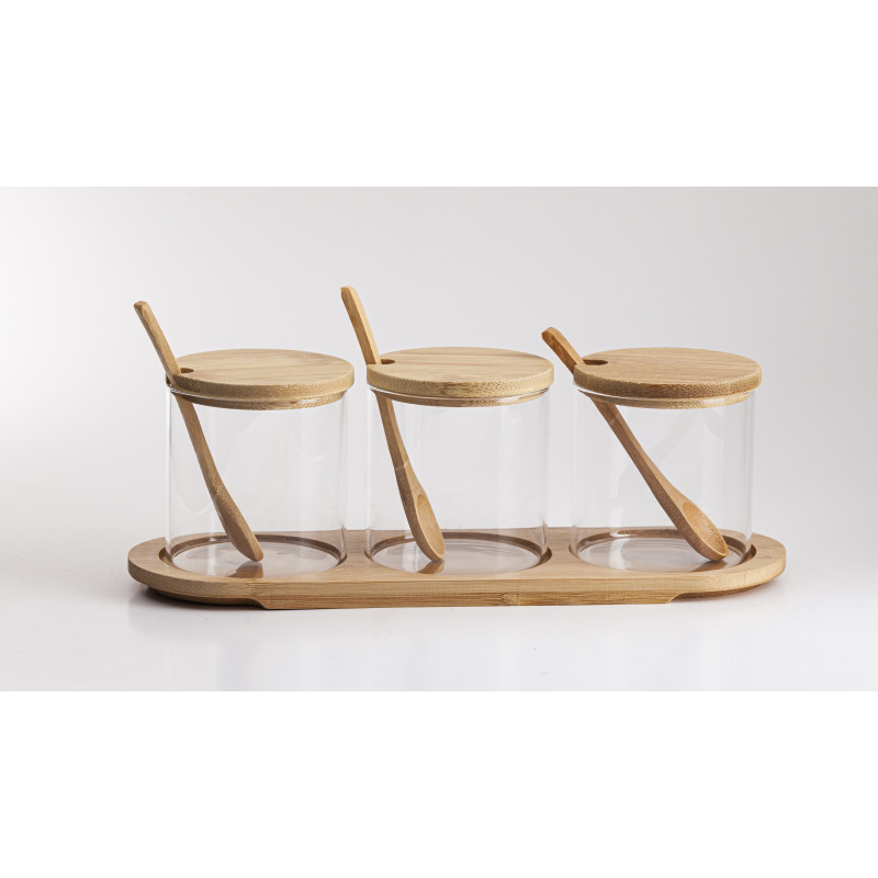 Набір банок Bamboo Об'єм: 350 мл Матеріал: скло Матеріал кришки: бамбук Матеріал підставки та ложок: бамбук Кількість предметів: 3шт.