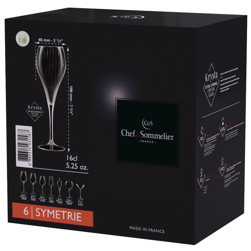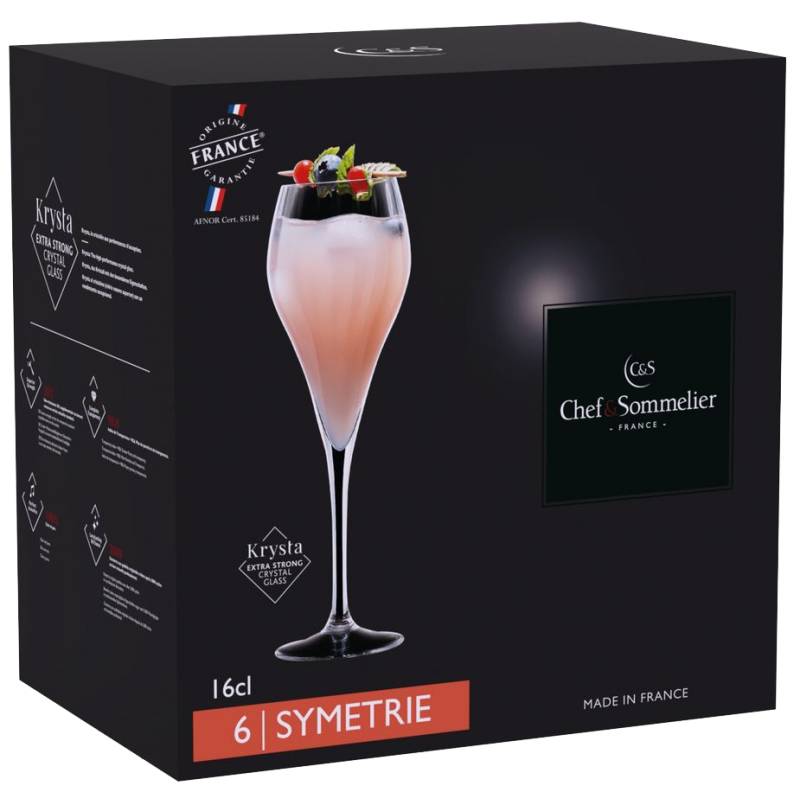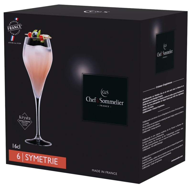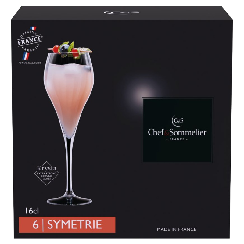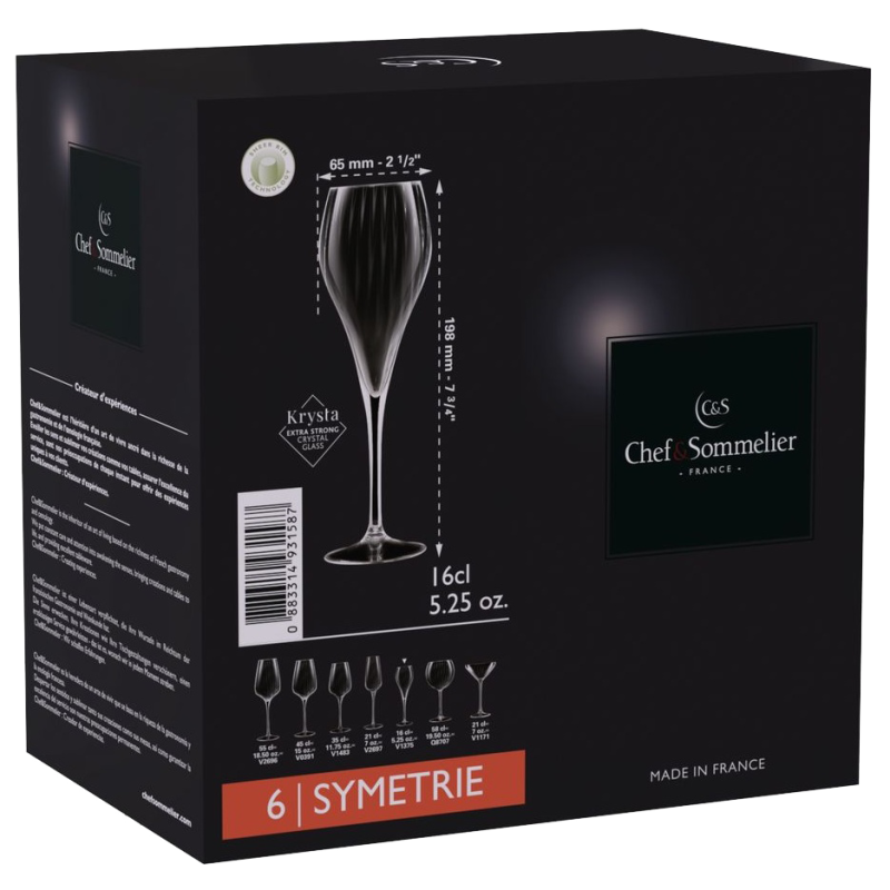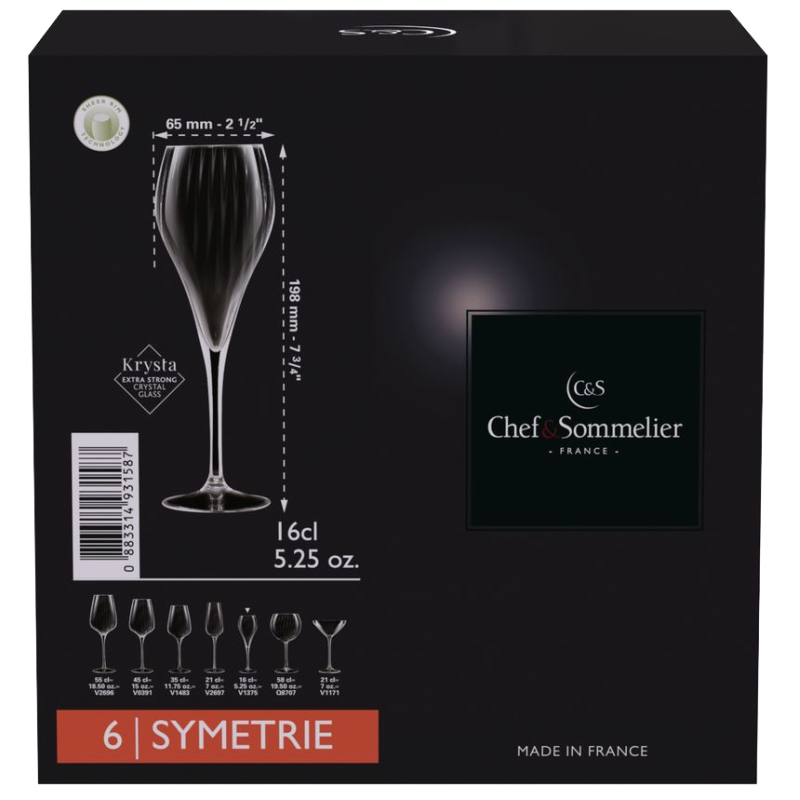 Серія Symétrie – це новий вид колекції від Chef&Sommelier. Ця лінія з широким асортиментом продукції відповідає потребам рестораторів, барменів і просто поціновувачів незвичного та естетичного. Особливістю цієї колекції є вертикальні лінії, що проходять уздовж келихів, створюючи гіпнотичний оптичний ефект.