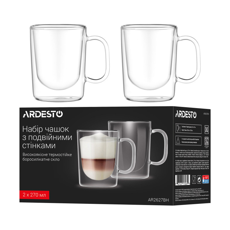 Набір чашок з ручками і подвійними стінками ARDESTO, 270мл, 2шт, боросилікатне скло, прозорий