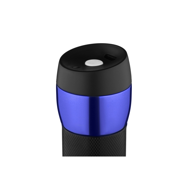 Термочашка на 450 мл з вакуумною технологією зберігання температури – до 8 годин для гарячих напоїв, та 12 годин для холодних. Зовнішня металева частина пофарбована у синій колір з глянсовою текстурою. Для зручності передбачено силіконове покриття під долоню. Внутрішня частина виконана з нержавіючої сталі 18/10. Нековзка основа запобігає перевертанню, а пластикова кришка отримала силіконову прокладку та кнопку відкриття отвору для пиття.