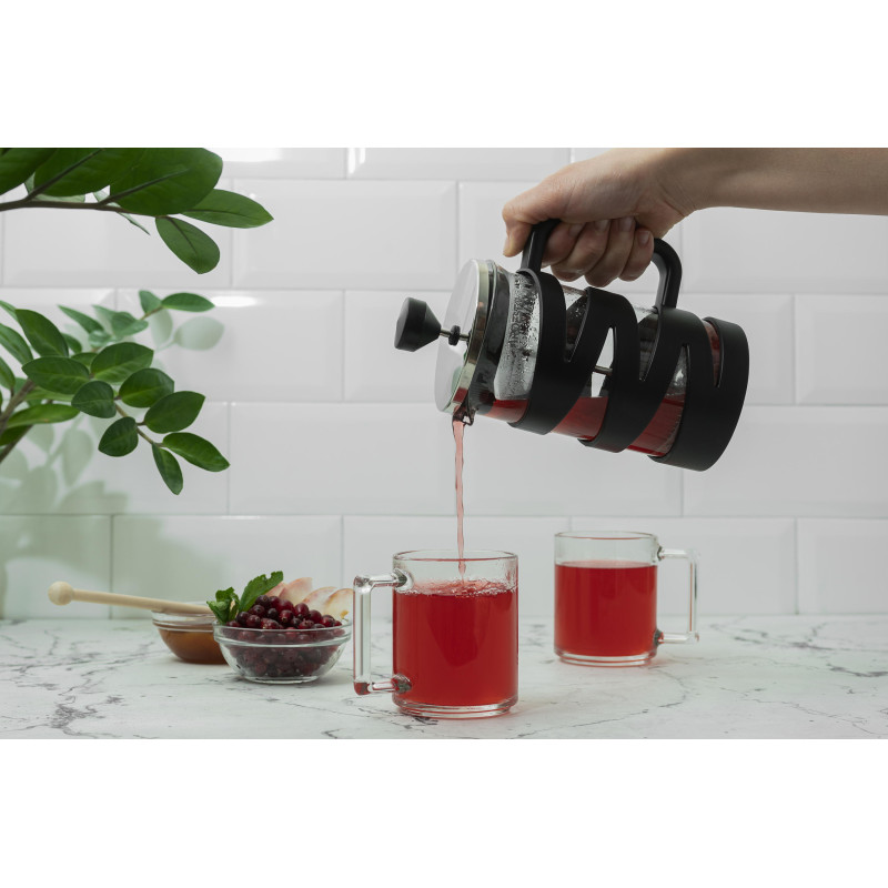 Оригінальний прозорий френч-прес для приготування гарячих і холодних напоїв виготовлено із надійного боросилікатного скла, нержавіючої сталі та чорного пластику. Об’єм – 600 мл. Вирізняється широким діапазоном термостійкості: від -20 °C до 230 °C. Можна мити в посудомийній машині.