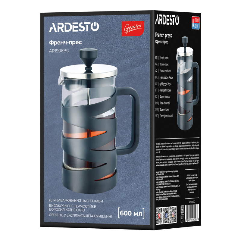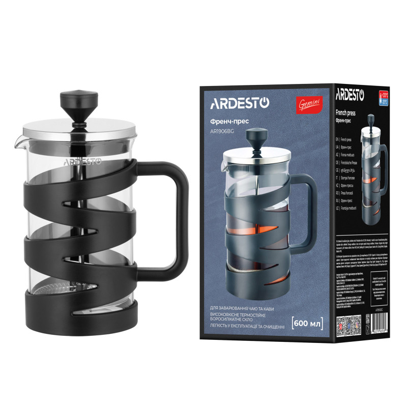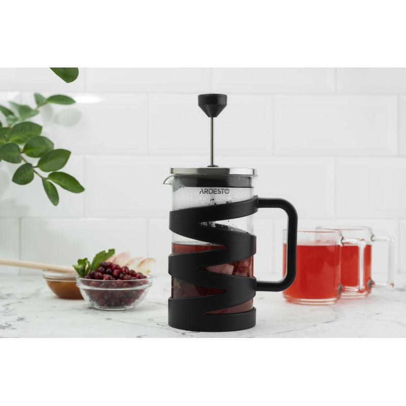 Френч-прес ARDESTO Gemini, 600мл, боросилікатне скло, пластик, нержавіюча сталь, прозорий, чорний