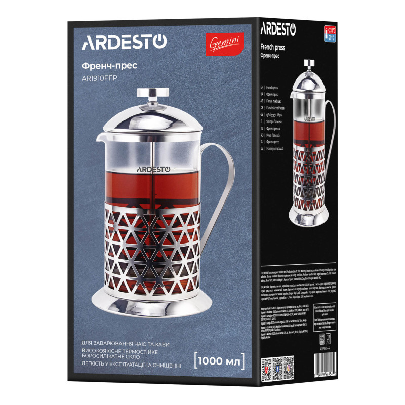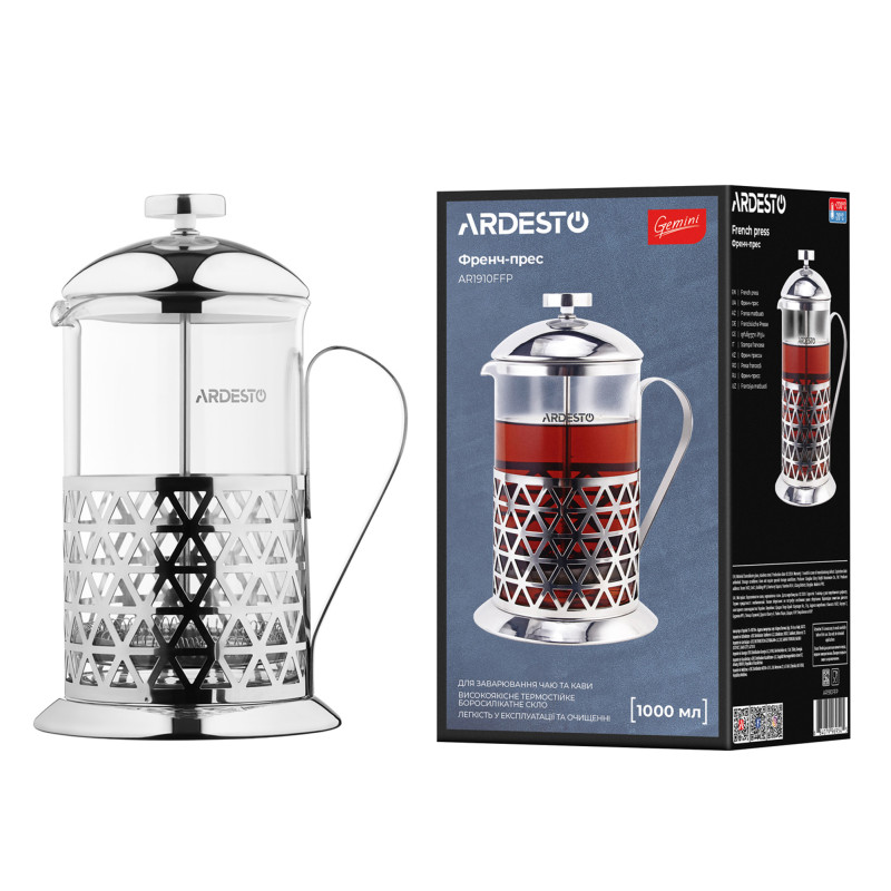 Френч-прес ARDESTO Gemini Fasano, 1000мл, боросилікатне скло, нержавіюча сталь, прозорий