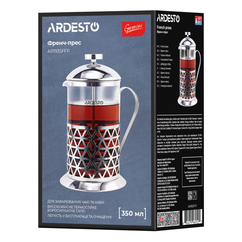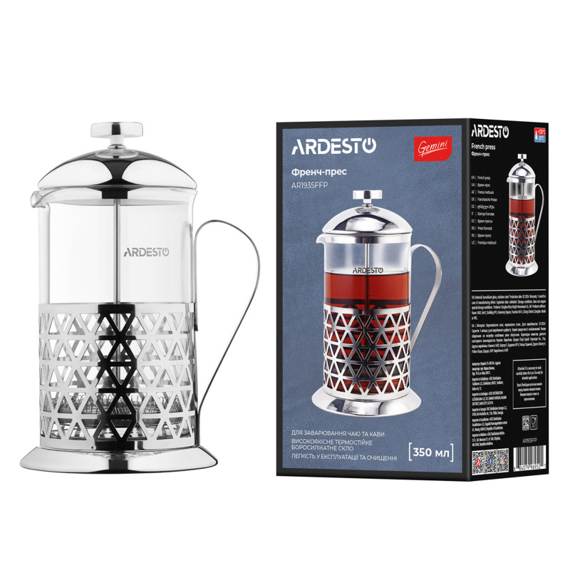 Френч-прес ARDESTO Gemini Fasano, 350мл, боросилікатне скло, нержавіюча сталь, прозорий