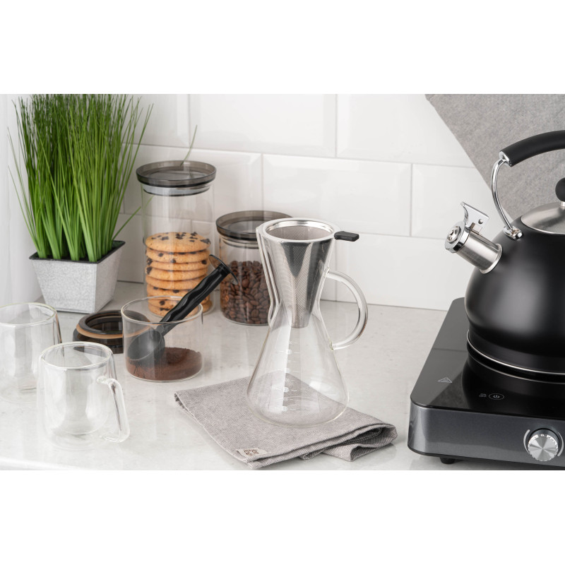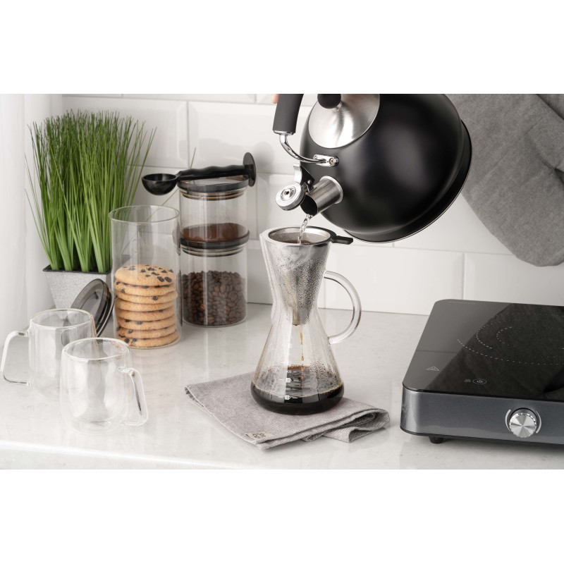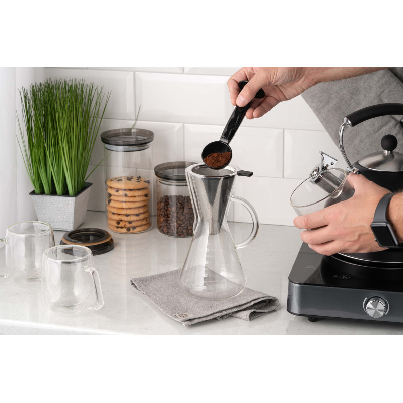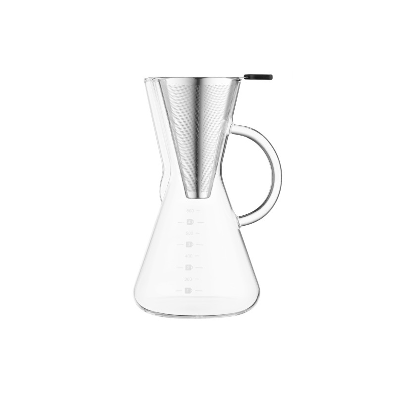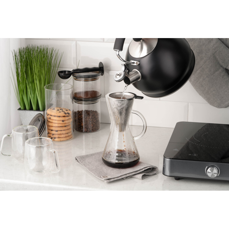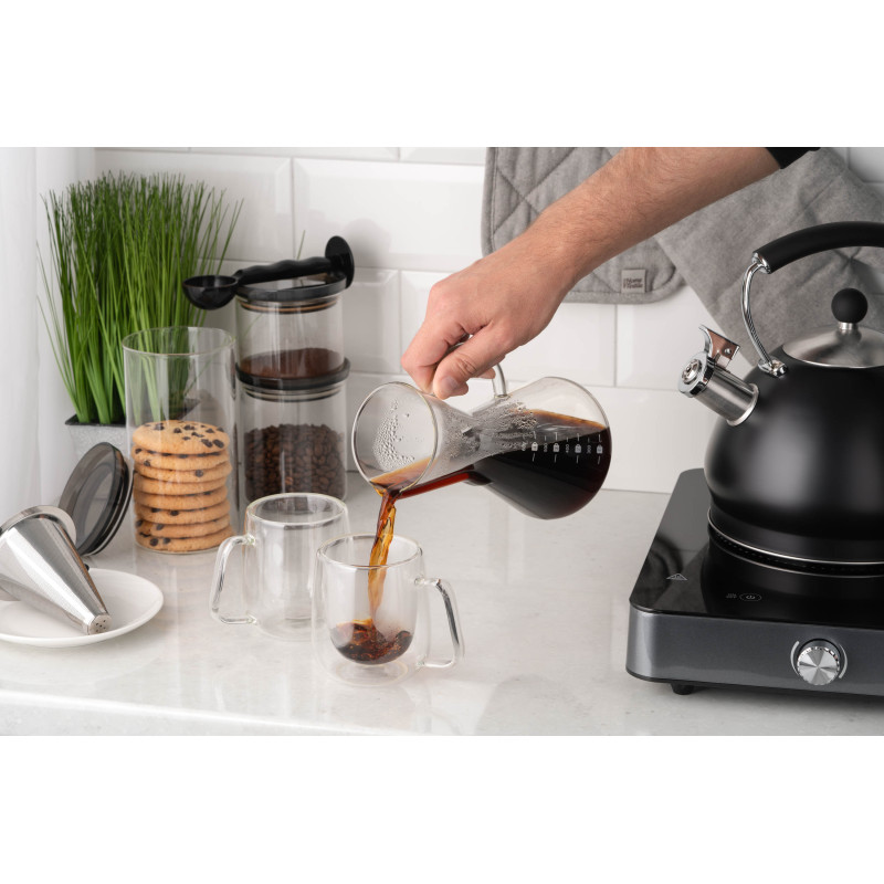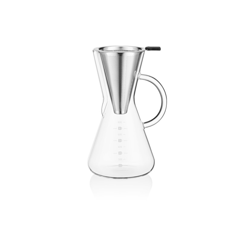 Кемекс для заварювання кави ARDESTO Black Mars вироблений із якісного боросилікатного скла, має фільтр із нержавіючої сталі. За діаметра дна 11 см і висоти 20 см об’єм становить 600 мл, чого цілком достатньо для одночасного приготування кількох порцій улюбленого напою. Діапазон термостійкості – від -20 до +150 °C, до того ж кемекс придатний до миття в посудомийній машині.