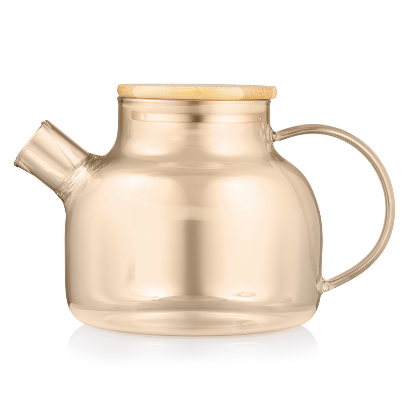 Заварник виготовлено з екологічного матеріалу – боросилікатного скла, яке не вбирає запахів, тому смак напою завжди залишатиметься незмінним. Матеріал вирізняється міцністю і стійкістю до перепадів температури, тож тривалий термін слугування і безпечне використання виробу гарантовано. Бамбукова кришка та золотистий відтінок скла додають виробу вишуканості. Об’єм моделі становить 1 000 мл. Це ліпший вибір для сімейних обідів, вечірок із друзями або для використання в офісі. Заварник згодиться для різних видів плит (газових, електричних, склокерамічних, галогенних), його можна підігрівати на помірному вогні та мити в посудомийній машині (крім бамбукової кришки).