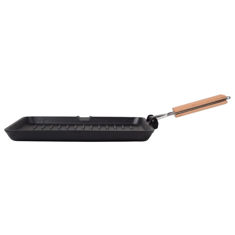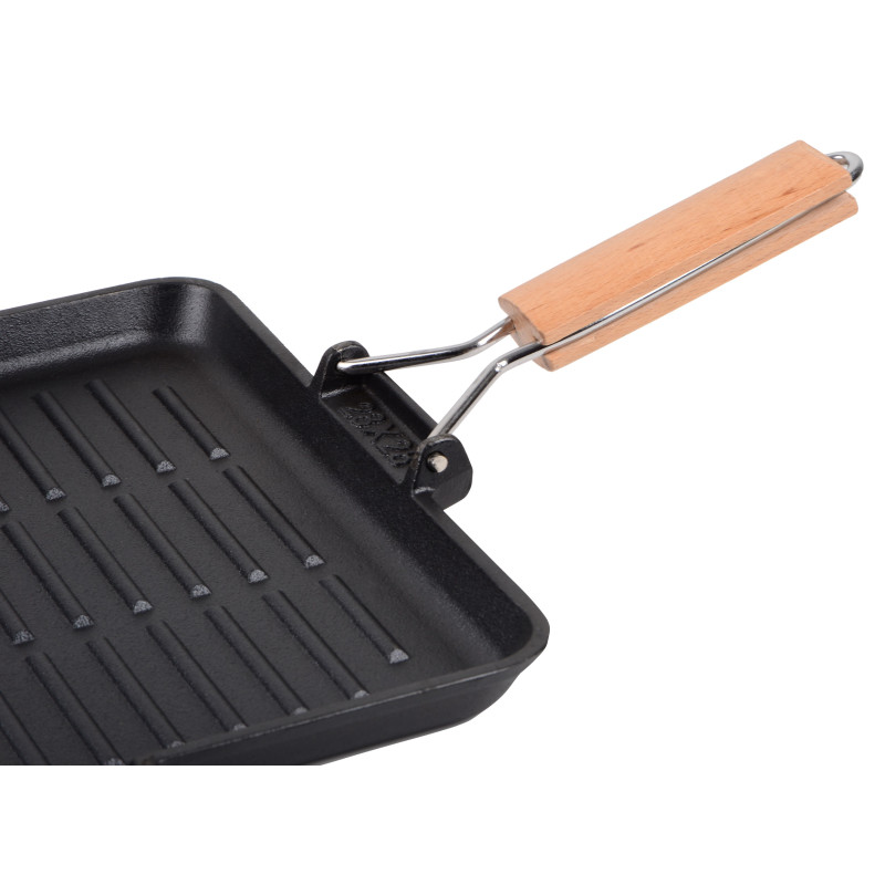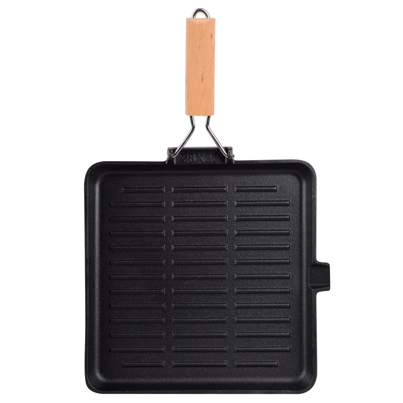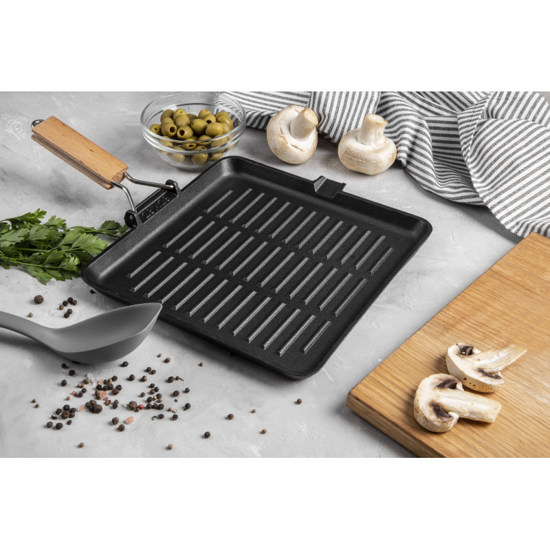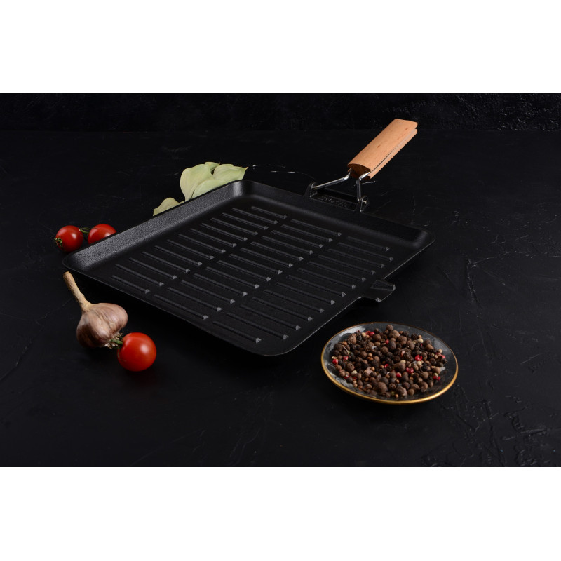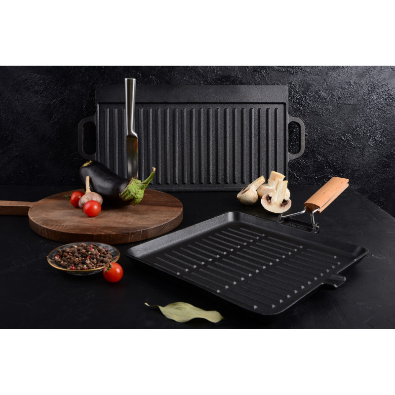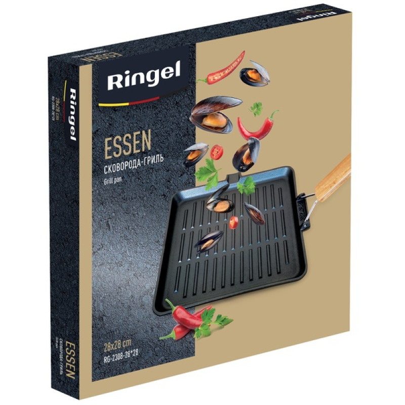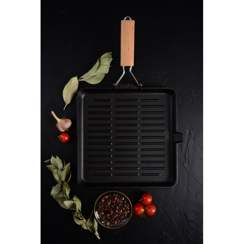 Сковорода-гриль серії ESSEN виготовлена з екологічно чистого чавуну, що має оптимальний розмір 28х28 см і є незамінним помічником у приготуванні соковитих м’ясних стейків, овочів гриль, ковбасок з хрумкою скоринкою тощо.