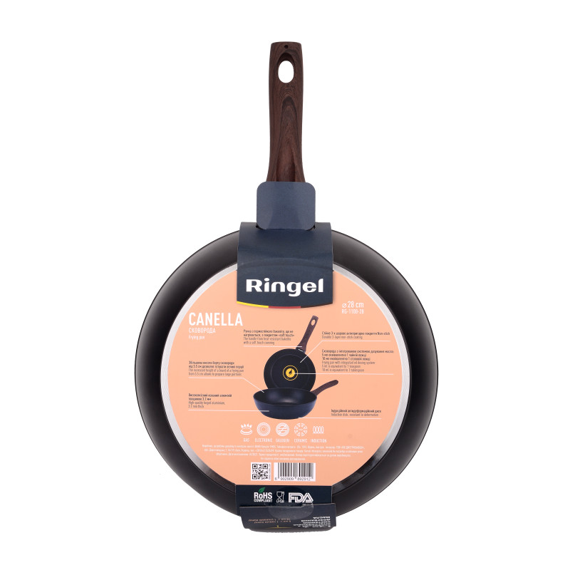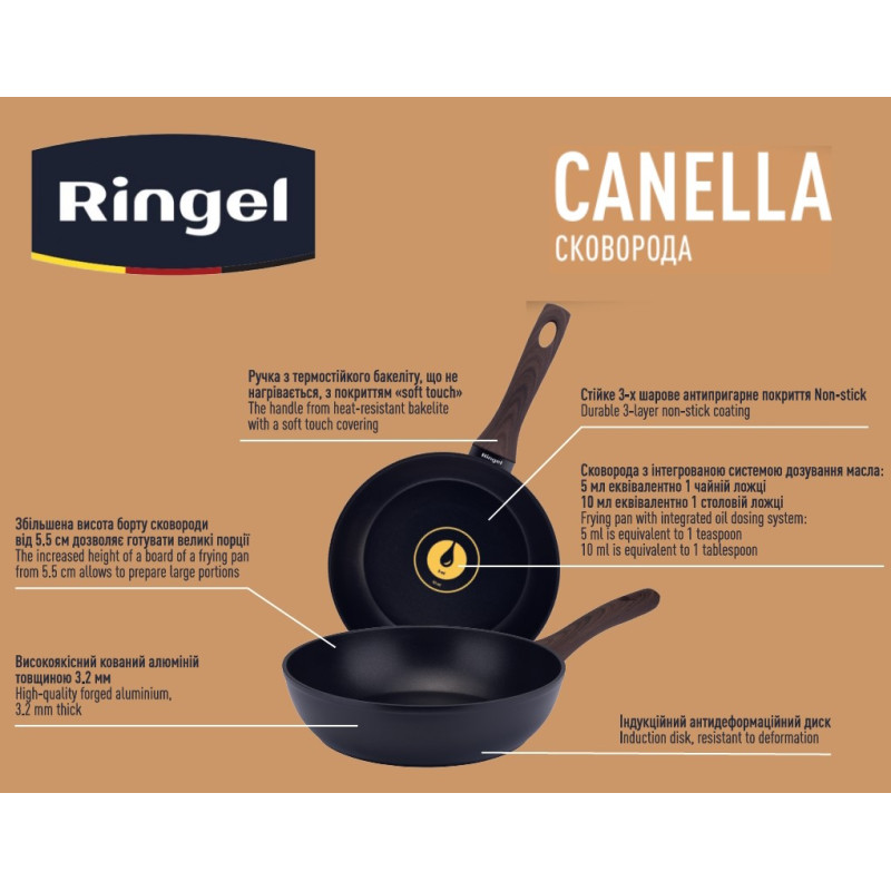 В кожну сковороду RINGEL інтегрована перша в світі система дозування олії. Найменша поділка системи відповідає 5 мл олії, а більша – 10 мл олії. За допомогою цієї системи ви зможете легко та швидко приготувати водночас здорові та смачні страви з використання мінімуму жиру та з максимальним збереженням корисних речовин у страві.