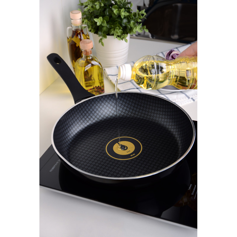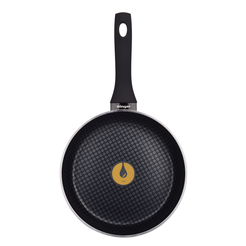 В кожну сковороду RINGEL інтегрована перша в світі система дозування олії. Найменша поділка системи відповідає 5 мл олії, а більша – 10 мл олії. За допомогою цієї системи ви зможете легко та швидко приготувати водночас здорові та смачні страви з використання мінімуму жиру та з максимальним збереженням корисних речовин у страві.
