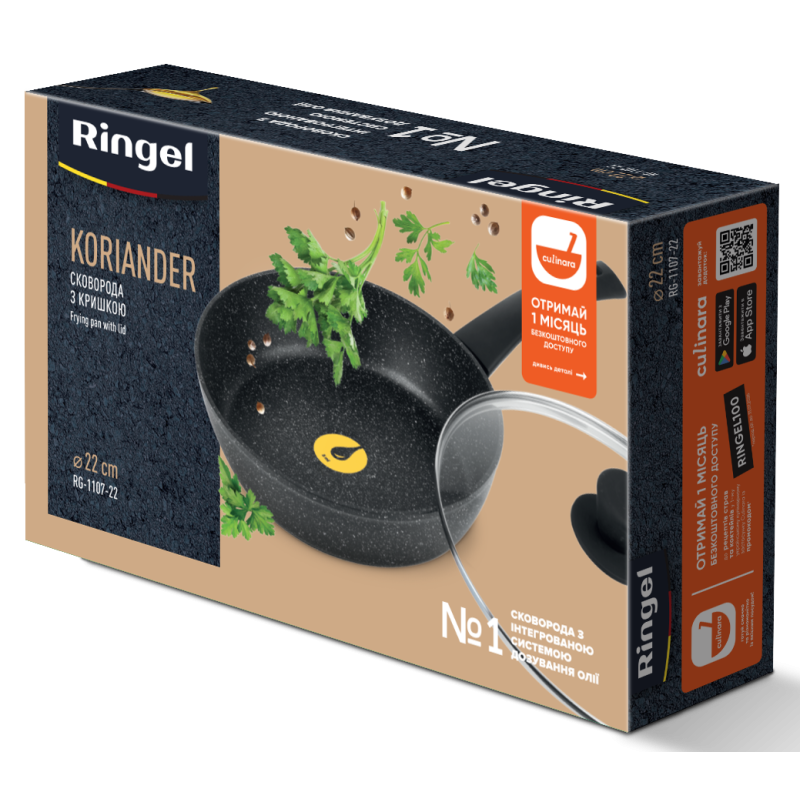 Колекція сковорідок Koriander виготовлена з високоякісного кованого алюмінію 3,2 мм, має надстійке антипригарне мармурове покриття Marble coating, яке є дуже зносостійким навіть при інтенсивному використанні. Вироби Koriander також мають зовнішнє антипригарне покриття - для легкого догляду.