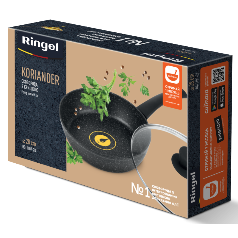 Нова колекція сковорідок Koriander, виготовлена з високоякісного кованого алюмінію 3,2 мм, має надстійке антипригарне мармурове покриття Marble coating, яке є дуже зносостійким навіть при інтенсивному використанні. Продукція Koriander також має зовнішнє антипригарне покриття - для легкого догляду.