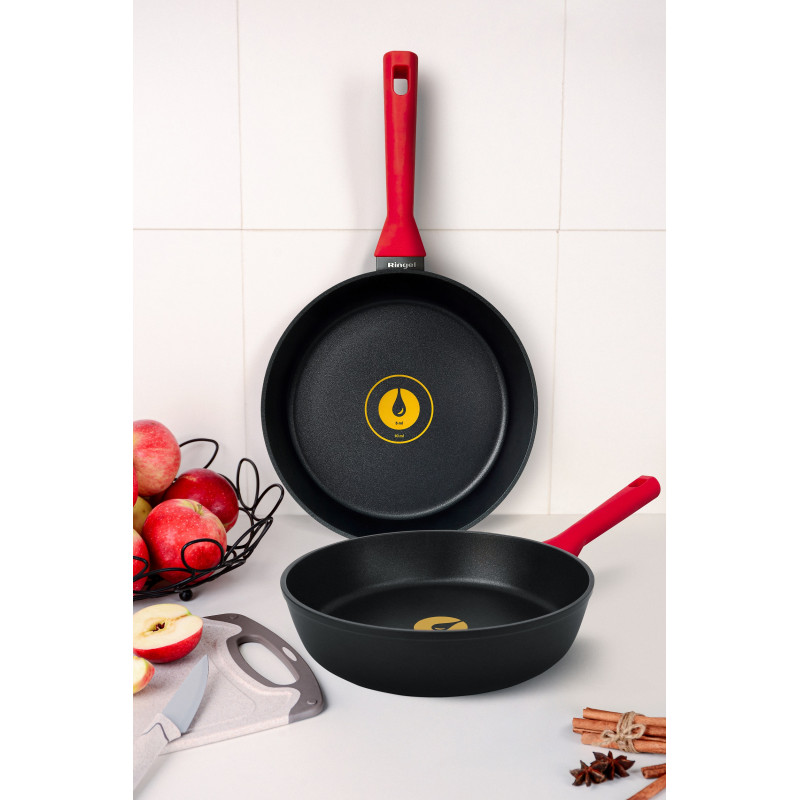 Серія сковорідок Pepperoni від Ringel - це відмінний варіант як для приготування страв з соусів, самих соусів і тушкування, завдяки високим бортикам, так і прекрасний посуд для розігрівання. Виготовлені з високоякісного кованого алюмінію, дані сковороди є міцним посудом зі швидким і рівномірним нагріванням. Дно сковорідок цієї серії має додаткове потовщення до 4 мм, порівняно зі стінками у 3 мм. У даній серії використовується надстійке тришарове антипригарне покриття, що дозволяє використовувати менше олії при приготуванні