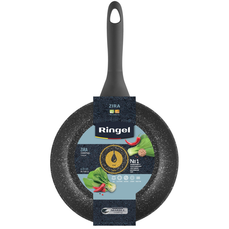 У кожну сковороду RINGEL інтегрована перша у світі система дозування олії. Найменша поділка системи відповідає 5 мл олії, а більша – 10 мл олії. За допомогою цієї системи ви зможете легко та швидко приготувати водночас здорові та смачні страви з використання мінімуму жиру та з максимальним збереженням корисних речовин у страві.