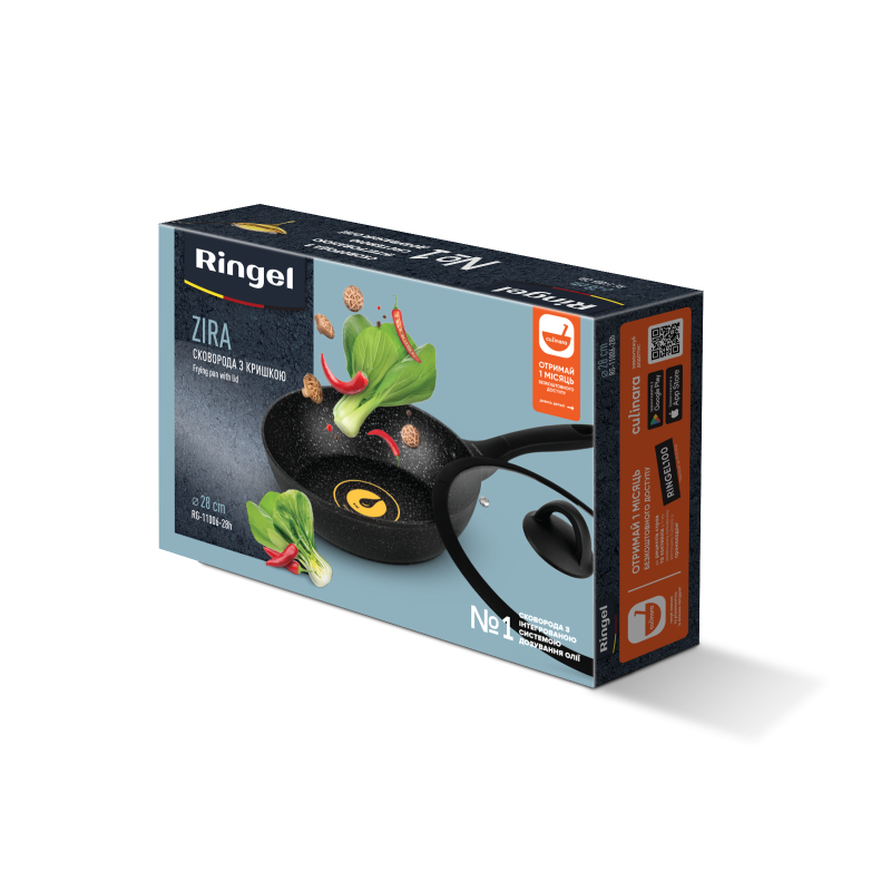 Сковорода з кришкою Zira від Ringel - це відмінний варіант як для приготування страв із соусів, самих соусів і тушкування, завдяки високим бортикам, так і прекрасний посуд для розігрівання. Виготовлені з високоякісного кованого алюмінію, дані сковороди є міцним посудом зі швидким і рівномірним нагріванням. Дно сковорідок цієї серії має додаткове потовщення до 3,2 мм. У даній серії використовується надстійке тришарове антипригарне покриття, що дозволяє використовувати менше олії при приготуванні.