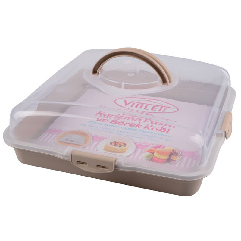 Тортівниця Violet House 0036 Каризма Cappucino виготовлена з високоякісного та міцного харчового пластику. Не окислюється, не забарвлюється і не вбирає запахи. Кришка щільно прилягає до піддону, захищаючи від обвітрювання та потрапляння сторонніх запахів. Тортівниця має ручку та бокові застібки завдяки цьому її зручно та безпечно тримати та транспортувати. Розміри (ВхШхД): 13х38х38 см.