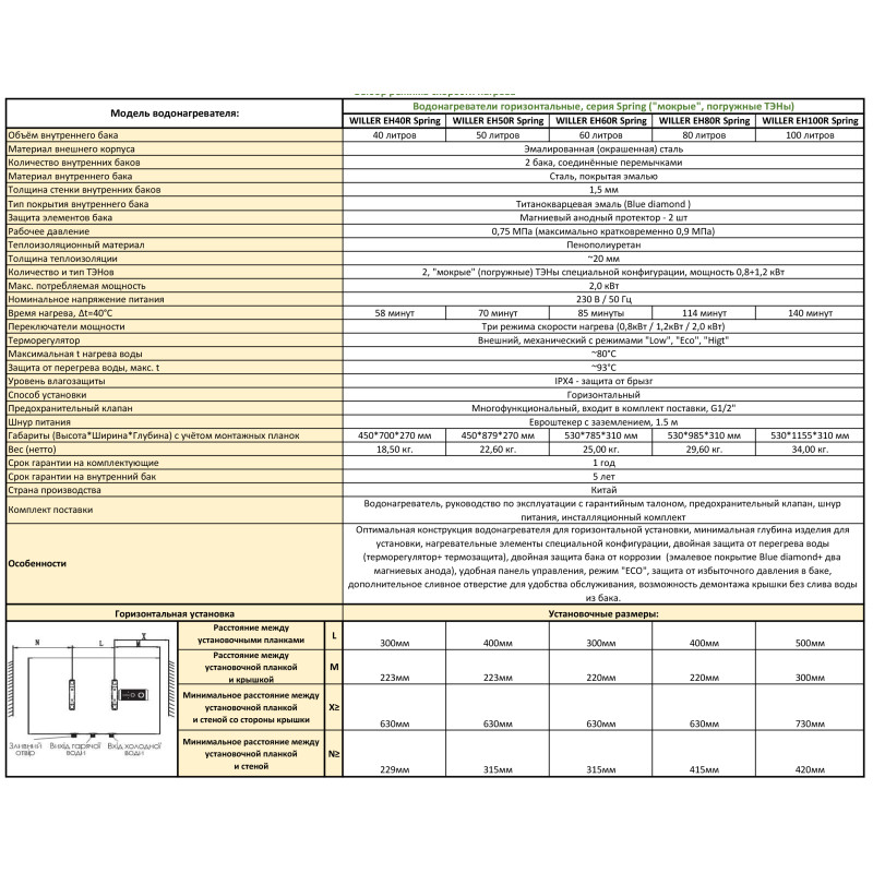 Плоский накопичувальний електричний водонагрівач із внутрішнім баком із емальованої сталі ємністю 60 літрів. Оснащений подвійним занурювальним (мокрим) нагрівальним елементом загальною потужністю 2,0 кВт. Внутрішній бак, виготовлений із емальованої сталі, та захисний магнієвий анод забезпечують тривалий термін експлуатації.